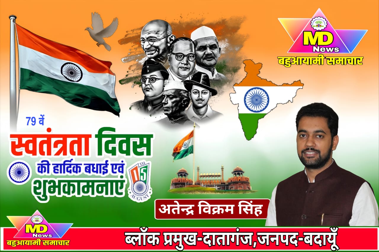 बदायूँ-अतेन्द्र विक्रम सिंह उर्फ अंकित भैया-ब्लॉक प्रमुख, दातागंज, जनपद बदायूँ की तरफ से समस्त क्षेत्रवासियों एवं देशवासियों को 79वें स्वतंत्रता दिवस की हार्दिक शुभकामनाएं..