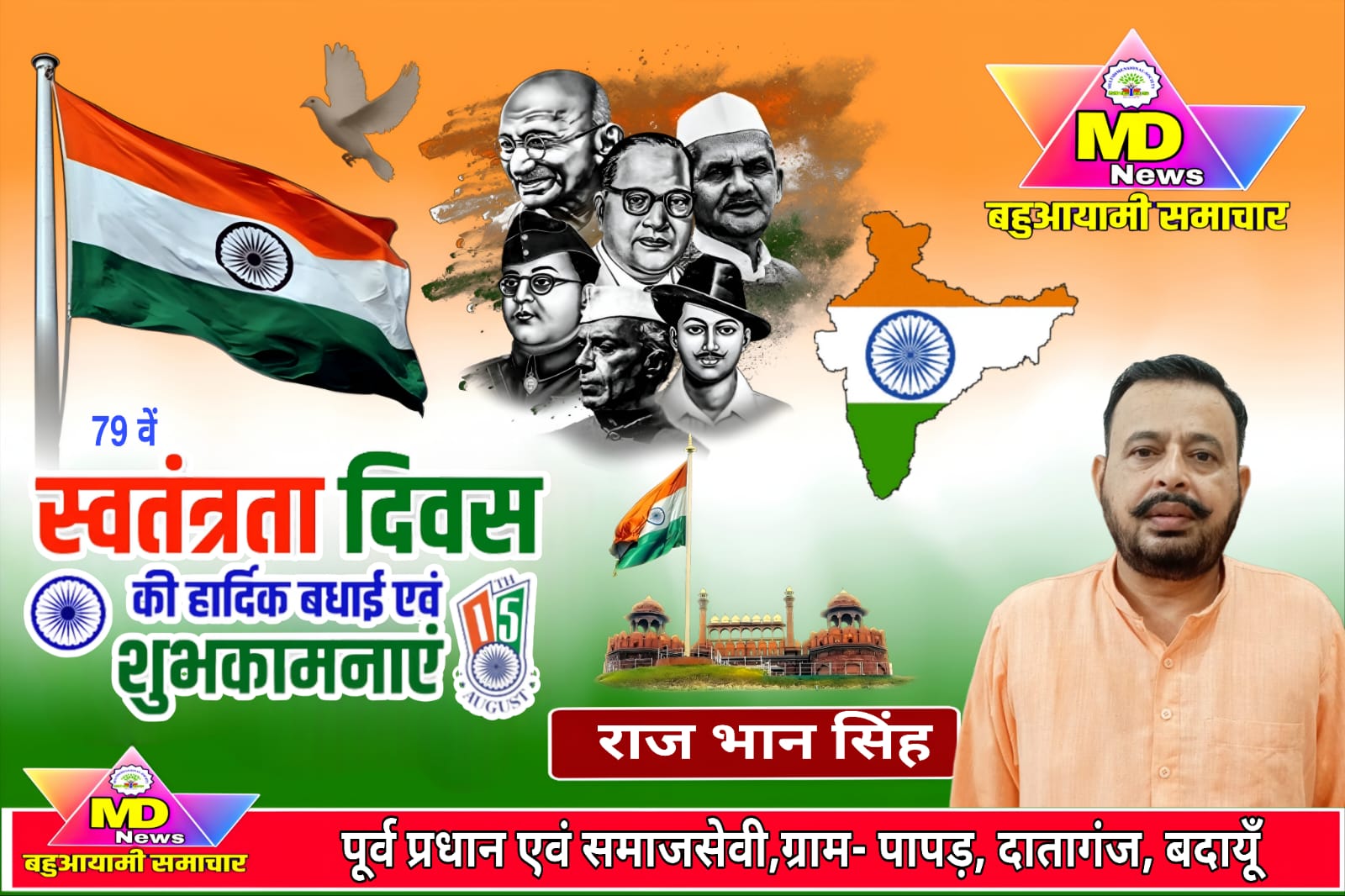 बदायूँ:राज भान सिंह-पूर्व प्रधान व समाजसेवी, ग्राम-पापड़,दातागंज,बदायूँ की तरफ से समस्त ग्रामवासियों एवं क्षेत्रवासियों को 79 वें स्वतंत्रता दिवस की हार्दिक शुभकामनाएं..