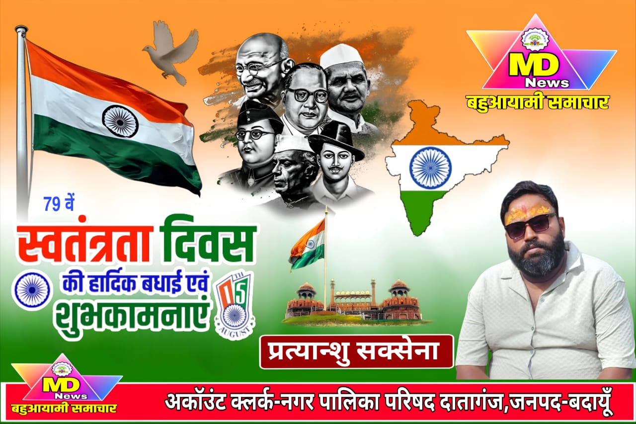 बदायूँ-प्रत्यान्शु सक्सेना, अकॉउंट क्लर्क,दातागंज बदायूँ की तरफ से आप समस्त क्षेत्रवासियों एवं देशवासियों को 79वें स्वतंत्रता दिवस की हार्दिक शुभकामनाएं..