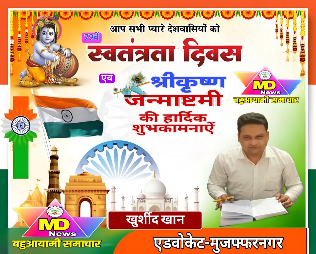 मुजफ्फरनगर-खुर्शीद खान,एडवोकेट-जनपद-मुजफ्फरनगर की तरफ से समस्त क्षेत्रवासियों एवं देशवासियों को 79वें स्वतंत्रता दिवस एवं श्रीकृष्ण जन्माष्टमी की हार्दिक शुभकामनाएं.