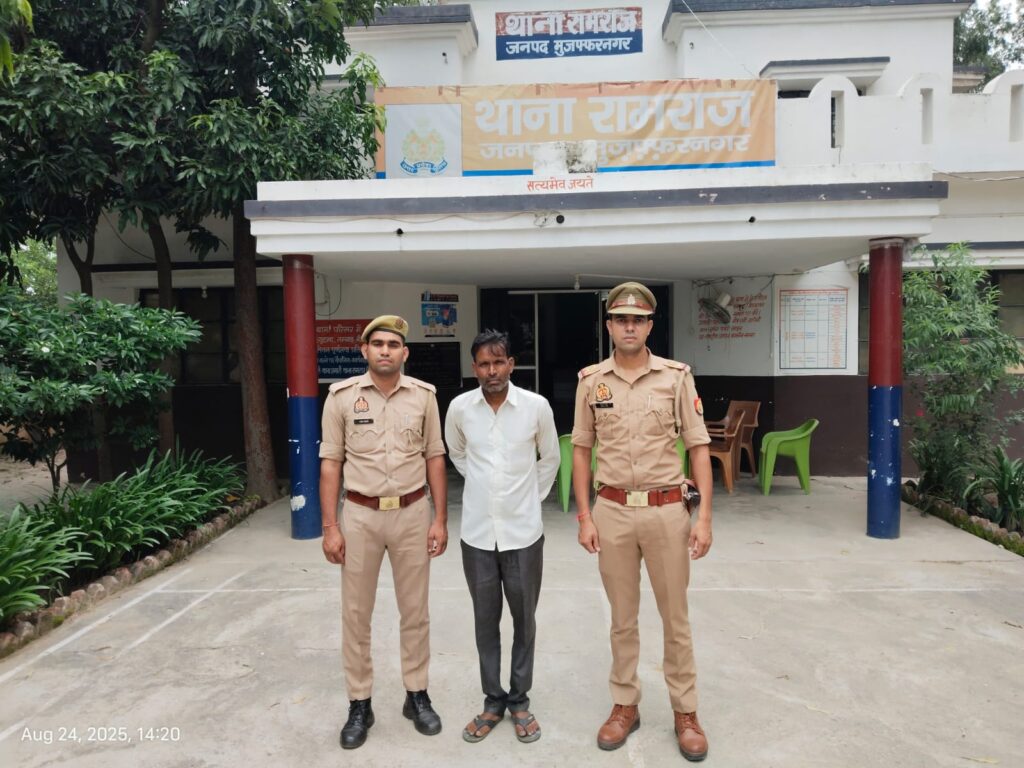 वरिष्ठ पुलिस अधीक्षक संजय कुमार वर्मा जनपद मुजफ्फरनगर के एंवम रामराज थाना प्रभारी जयसिंह नागर के कुशल नेतृत्व मे आज दिनांक 24,08,2025, को रामराज पुलिस ने एक वाछिंत वारंटी अभियुक्त ईलमचन्द पुत्र विशम्बर, निवासी ग्राम हुसैनपुर थाना रामराज मुजफ्फरनगर को उसके घर से गिरफ्तार किया गया। अभियुक्त को माननीय न्यायलाय के सक्षम पेश किया जा रहा है।अभियुक्त कई महीने से वाछिंत चल रहा था। अभियुक्त को गिरफ्तार करने वाले रामराज पुलिस टीम मे शामिल उप निरकक्षक हर्षित शर्मा, उप,निरकक्षक जीतन सिंह, व हैड कास्टेबल सतपाल सिंह आदि ने किया गिरफ्तार।