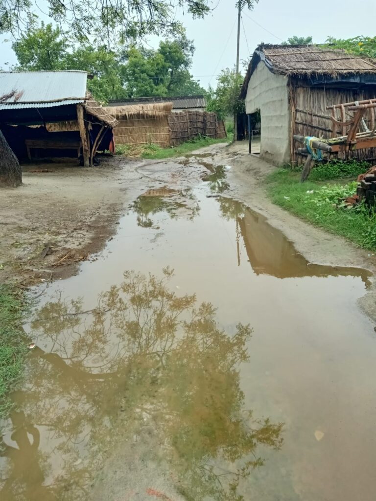 ●द्वरिका पुरवा में पाल बिरादरी के मोहल्ले से मुर्गी फार्म की सड़क पानी से भरी।