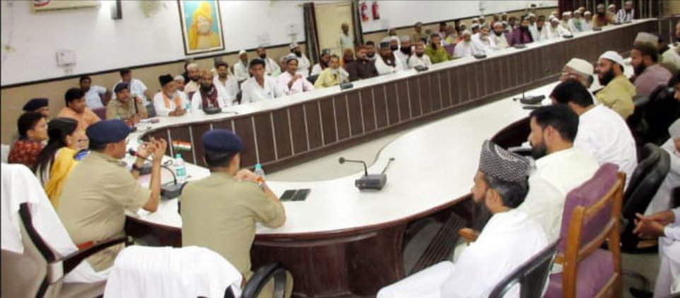जनपद में एकता, सोहार्द,प्रेम बनाए रखने के लिए आगामी शुक्रवार को होने वाली जुमे की नमाज को शांतिपूर्ण ढंग से सम्पन्न कराने हेतु धर्म गुरुओं के साथ पीस कमेटी की बैठक आयोजित की गई । इस दौरान जिलाधिकारी दीपा रंजन,वरिष्ठ पुलिस अधीक्षक डॉ ओपी सिंह,एडीएम प्रशासन ऋतु पुनिया, एसपी सिटी प्रवीण चौहान, एसपी देहात सिद्धार्थ वर्मा सहित धर्मगुरु मौजूद रहे ।