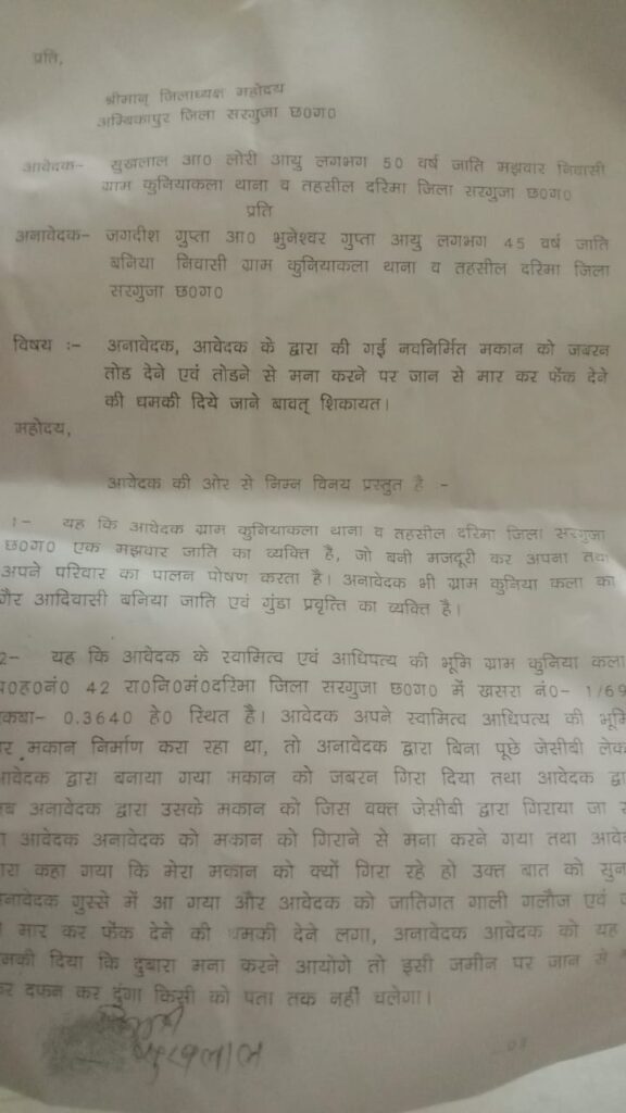 —— हिमांशु राज एम.डी. न्यूज वॉइस ब्यूरो चीफ अंबिकापुर जिला सरगुजा छत्तीसगढ़। ग्राम पंचायत कुनिया कला थाना तहसील दरिमा मझवार जनजाति के सुखलाल आत्मज लोरी आयु लगभग 50 वर्ष व्यक्ति ने बताया क्या अनावेदक जगदीश गुप्ता आत्मज भुनेश्वर गुप्ता आर यू लगभग 45 वर्ष जाति बनिया निवासी ग्राम पंचायत कुनियाकला गैर आदिवासी बनिया जाती का गुंडा प्रवृत्ति का व्यक्ति है।आवेदक के स्वामित्व एवं आधिपतय की भूमि ग्राम कुनिया कला पटवारी हल्का नंबर 42 रा.नि.मं दरिमा जिला सरगुजा छत्तीसगढ़ में खसरा नंबर 1/69 रकबा 0.3640 हेक्टेयर स्थित है आवेदक अपने स्वामित्व आधिपत्य की भूमि और मकान निर्माण कर रहा था तो अनावेदक द्वारा बिना पूछे जेसीबी लेकर आवेदक द्वारा बनाया गया मकान को जबरन गिरा दिया गया तथा आवेदक द्वारा जब अनावेदक द्वारा उसके मकान को जिस वक्त जेसीबी द्वारा गिराया जा रहा था आवेदक अनावेदक को मकान को गिरने से मना करने गया था तथा आवेदक द्वारा कहा गया कि मेरा मकान को क्यों गिरा रहे हो उक्त बात को सुनकर अनावेदक गुस्से में आ गया और आवेदक को जातिगत गाँलि गलौज एवं जान से मार कर फेंक देने की धमकी देने लगा अनावेदक आवेदक को यह भी धमकी दिया कि दोबारा मना करने आओगे तो इसी जमीन पर जान से मार कर दफन कर दूंगा किसी को पता तक नहीं चलेगा आवेदक सुखलाल आत्मज लोरी आयु 50 वर्ष जाति मझवार निवासी कुनिया कला थाना तहसील अनावेदक के द्वारा नवनिर्मित मकान को ध्वस्त कर देने पर आवेदक को भारी आर्थिक एवं मानसिक क्षति हुई है बनी मजदूरी करके किसी प्रकार मकान का निर्माण कर रहा था और अनावेदक उक्त धमकी से की आवेदक व उसका परिवार काफी भयभीत हो गए हैं और अनावेदक से डर डर कर अपना जीवन यापन कर रहे हैं आवेदक ने कलेक्टर जनदर्शन कार्यक्रम में कलेक्टर श्री विलास भोसकर से कार्रवाई की मांग की है।