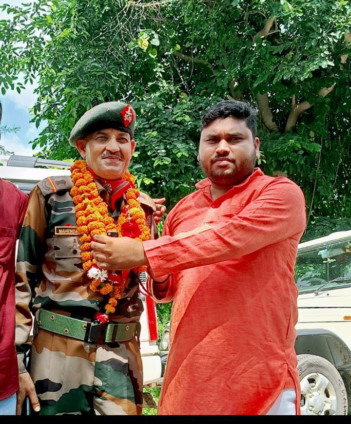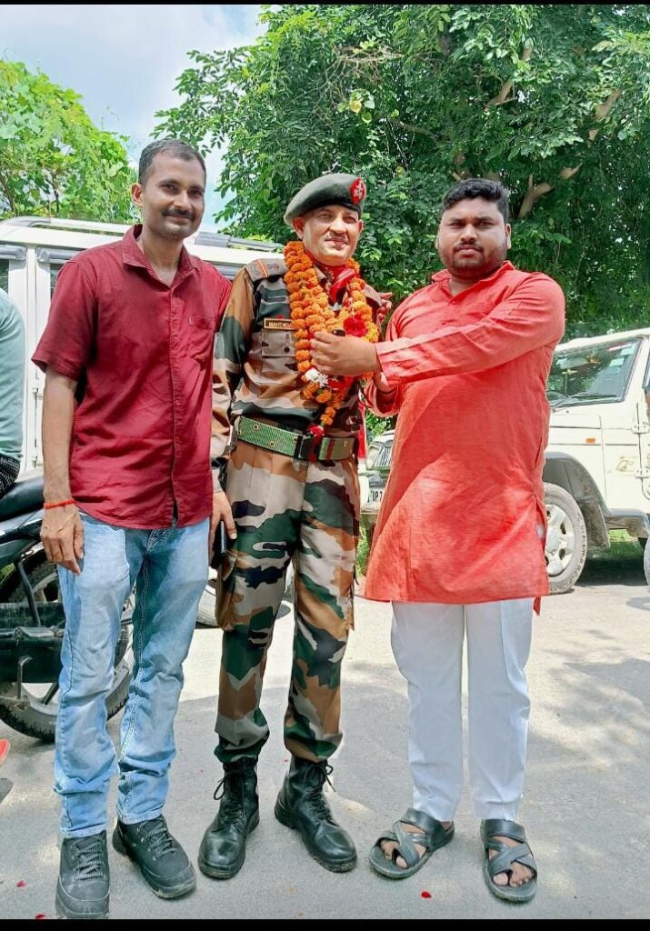 रिपोर्ट शिवम् यादव MD news Kannauj 33 साल सेना में सेवा करने वाले जवान को सम्मानः उमर्दा में समाजवादी नेता रवि यादव ने माला पहनाकर किया सम्मानित किया ( जवान को सम्मानित करते लोग। बेला क्षेत्र के दिबियापुर रोड पर एक भावुक कार्यक्रम का आयोजन किया गया। यहां 33 साल की सैन्य सेवा से सेवानिवृत्त होकर लौटे महेंद्र पाल सिंह यादव का स्थानीय लोगों ने भव्य स्वागत: कार्यक्रम में धर्मेंद्र, लालू यादव, टीटू,दीपू, सतेंद्र कुमार और शिवम् सुदीप यादव सपा नेता सहित बड़ी संख्या में स्थानीय लोगों ने भी हिस्सा लिया। सभी ने सेवानिवृत्त सैनिक के प्रति आभार व्यक्त किया।