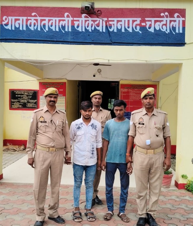 चन्दौली- आदित्य लांग्हे, पुलिस अधीक्षक चन्दौली द्वारा अपराध व अपराधियो के विरूद्ध प्रभावी रोकथाम व कार्यवाही हेतु चलाये जा अभियान के क्रम में दिगम्बर कुशवाहा, अपर पुलिस अधीक्षक ऑपरेशन व रघुराज, क्षेत्राधिकारी चकिया के कुशल पर्यवेक्षण में थानाध्यक्ष चकिया अर्जुन सिंह के नेतृत्व में थाना चकिया पुलिस टीम द्वारा आज दिनांक 03.09.2025 को समय लगभग 01.30 बजे थाना स्थानीय पर पंजीकृत मु.अ.सं. 169/2025 धारा 305/331(4)/317(2) बीएनएस व मु.अ.सं. 170/2025 धारा 305/331(4)/317(2) बीएनएस से संबंधित अभियुक्त1. मोनू उर्फ मियानू पुत्र कैलाश ठठेरा निवासी सिकन्दरपुर थाना चकिया जनपद चन्दौली 2. सत्यम यादव पुत्र छोटेलाल यादव निवासी ग्राम सिकन्दरपुर थाना चकिया जनपद चन्दौली को शिव मंदिर सिकन्दरपुर से गिरफ्तार कर लिया गया गिरफ्तार अभियुक्तों के कब्जे से चोरी किये गये माल को बरामद किया गया। गिरफ्तार व बरामदगी के आधार पर अग्रिम विधिक कार्यवाही की जा रही है।