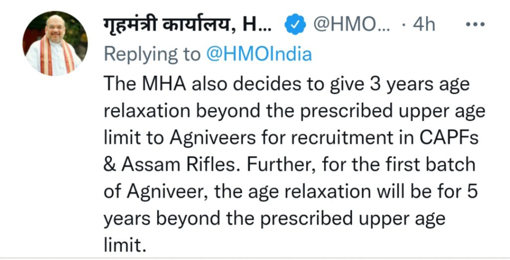 केंद्रीय गृह मंत्रालय का बड़ा फैसला : केंद्रीय सशस्त्र बलों और असम राइफल्स में अग्निवीरों के लिए आरक्षित होंगी 10% सीटें, उम्र सीमा में भी मिली छूट… सीएपीएफ और असम राइफल्स में भर्ती के लिए अग्निवीरों को तय ऊपरी आयु सीमा से 3 साल की छूट दी जाएगी। वहीं, अग्निवीर के पहले बैच के लिए आयु में छूट निर्धारित ऊपरी आयु सीमा से 5 वर्ष के लिए होगी।