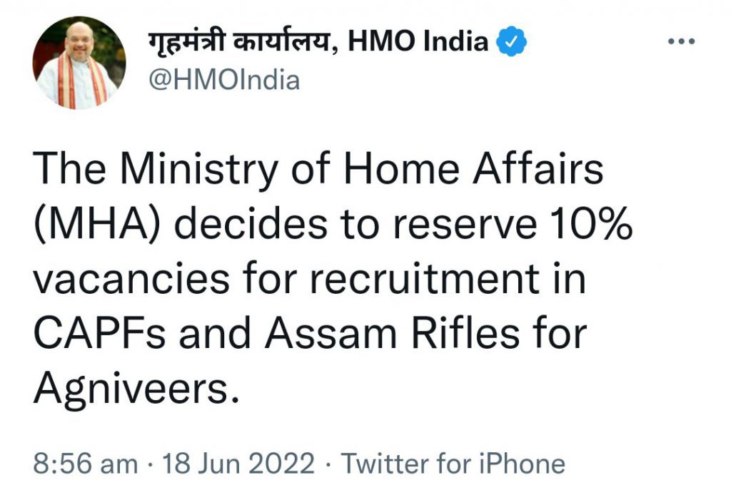 अग्निपथ योजना को लेकर बवाल के बीच केंद्रीय गृह मंत्रालय का बड़ा फैसला किया है। मंत्रालय ने केंद्रीय सशस्त्र सैनिक बलों (CAPFs) और असम राइफल्स में अग्निवीरों की भर्ती के लिए 10% सीटों को आरक्षित करने का फैसला किया है। इसके अलावा, अर्ध सैनिक बलों और असम राइफल्स में भर्ती के लिए अग्निवीरों को तय ऊपरी आयु सीमा से 3 साल की छूट दी जाएगी। अग्निवीर के पहले बैच के लिए उम्र में छूट निर्धारित ऊपरी आयु सीमा से 5 वर्ष के लिए होगी।