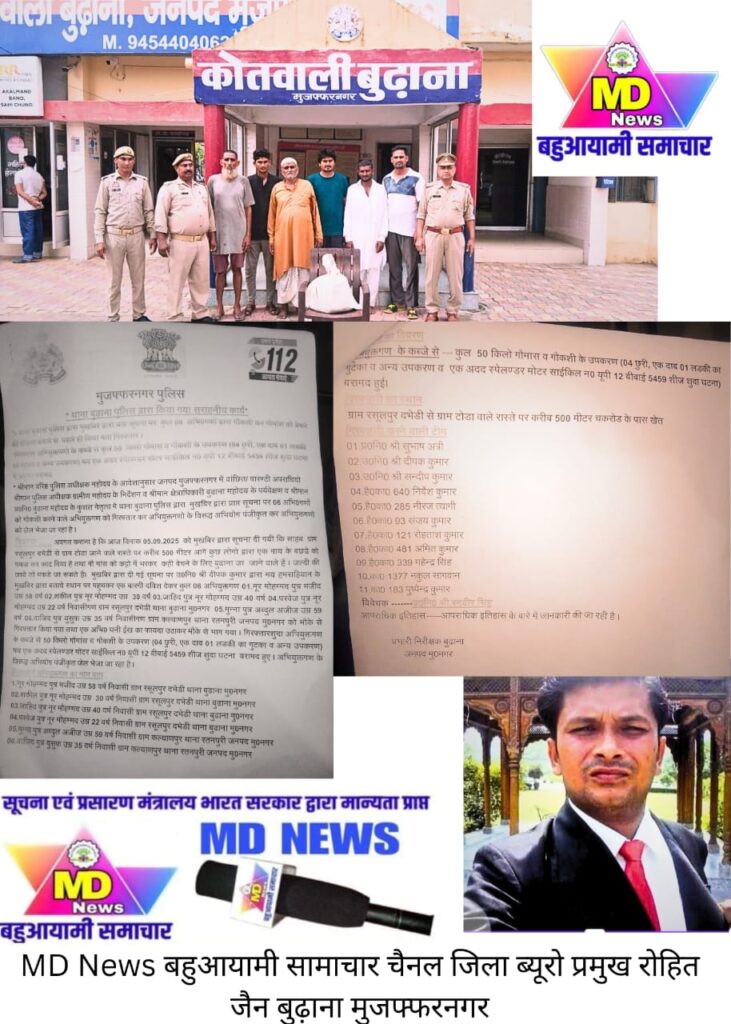 विवरण अवगत कराना है कि आज दिनाक 05.09.2025 को मुखबिर द्वारा सूचना दी गयी कि साहब ग्राम रसूलपुर दभेडी से ग्राम टोडा जाने वाले रास्ते पर करीब 500 मीटर आगे कुछ लोगो द्वारा एक गाय के बछडे को पकड कर काट दिया है तथा गौ मांस को कट्टो में भरकर कही बेचने के लिए बुढाना जाने वाले हैं जल्दी की जाये तो पकडे जा सकते है। मुखबिर द्वारा दी गई सूचना पर उ0नि0 श्री दीपक कुमार द्वारा मय हमराहियान के मुखबिर द्वारा बताये स्थान पर पहुचकर एक बारगी दविश देकर कुल 06 अभियुक्तगण 01.नूर मोहम्मद पुत्र मजीद उम्र 58 वर्ष 02.शकील पुत्र नूर मोहम्मद उम्र 30 वर्ष 03.जाहिद पुत्र नूर मौहम्मद उम्र 40 वर्ष 04.परवेज पुत्र नूर मौहम्मद उम्र 22 वर्ष निवासीगण ग्राम रसूलपुर दभेडी थाना बुढाना मु0नगर 05.मुन्ना पुत्र अब्दुल अजीज उम्र 59 वर्ष 06.वाजिद पुत्र युसुफ उम्र 35 वर्ष निवासीगण ग्राम कल्याणपुर थाना रतनपुरी जनपद मु0नगर को मौके से गिरफ्तार किया गया तथा एक अभि0 घनी ईख का फायदा उठाकर मौके से भाग गया गिरफ्तारशुदा अभियुक्तगण के कब्जे से 50 किलो गौमांस व गौकशी के उपकरण (04 छुरी, एक दाब 01 लकड़ी का गुटका व अन्य उपकरण) मय एक अदद स्पेलण्डर मोटर साईकिल न0 यूपी 12 बीबाई 5459 शीज शुदा घटना बरामद हुए । अभियुक्तगण के विरुद्ध अभियोग पंजीकृत जेल भेजा जा रहा है ।