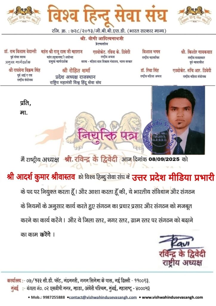 *वाराणसी उत्तर प्रदेश**वाराणसी*आदर्श श्रीवास्तव संवादाता एम डी न्यूज विश्व हिंदू सेवा संघ के उतर प्रदेश के मीडिया प्रभारी पद पर नियुक्त किए गए*राष्ट्रीय अध्यक्ष रविन्द्र के त्रिवेदी सदस्य महिला बाल विकास मंत्रालय भारत सरकार द्वारा उन्हें उत्तर प्रदेश मीडिया प्रभारी के पद पर नियुक्त किया।श्री किशोर गायकवाड़ पूर्व न्यायाधीश राष्ट्रीय सलाहकार राघवेन्द्र विक्रम सिंह राष्ट्रीय संयोजक एवं पूर्व आई°पी°एस प्रदेश अध्यक्ष रोहित शर्मा जीडॉ राम विलास वेदांती पूर्व संसद सदस्य प्रमुख मार्गदर्शक डॉ ऋचा सिंह, विशाल भगत, एडवोकेट रुचि आर त्रिवेदी एवं राष्ट्रीय कार्यकारिणी प्रदेश कार्यकारिणी के सदस्यों ने उनको बधाईयां एवम् उज्वल भविष्य की शुभकामनाएं दी।