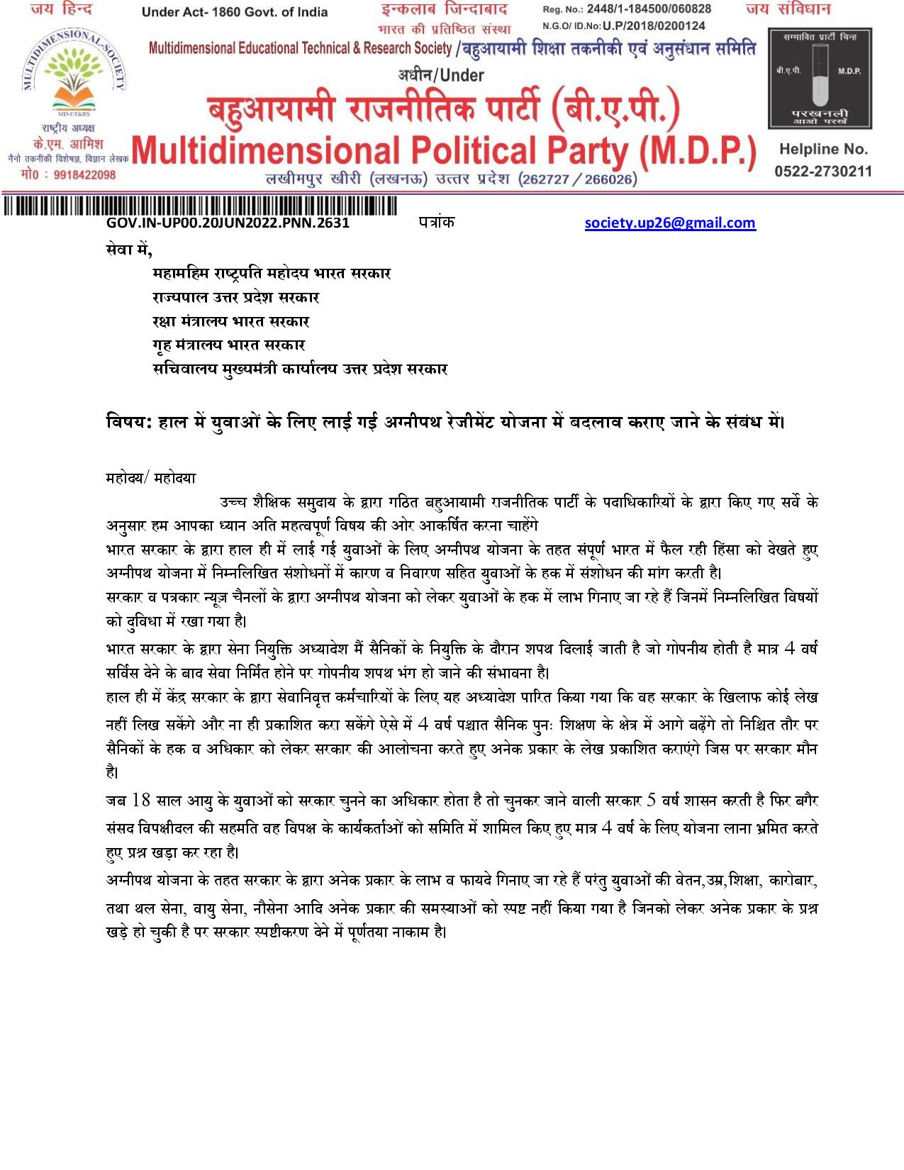 आदि अनेक प्रकार की भ्रांतियों को लेकर युवाओं के जेहन में अनेक प्रकार के प्रश्न गूंज रहे हैं जिसको सरकार युवाओं के बीच में युवाओं के समक्ष अधिकारिक तौर पर कागजी दस्तावेज के साथ में निर्णय लेने में पूर्णतया असमर्थ दिखाई दे रही है ऐसे में बहुआयामी पार्टी व बहुआयामी पार्टी के समस्त पदाधिकारी सरकार से मांग व सुझाव प्रेषित करते हैं कि उपरोक्त समस्याओं का निराकरण कराते हुए अग्नीपथ योजना में बदलाव किए जाएं।