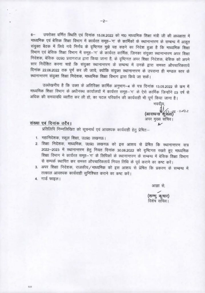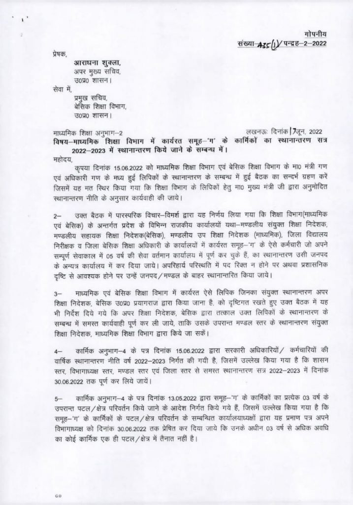 इस संबंध में दोनों विभाग के मंत्रियों के बीच हुई बैठक में तय किया गया है कि लिपिकों के लिए मुख्यमंत्री द्वारा अनुमोदित स्थानांतरण नीति के अनुसार कार्रवाई की जाए। इसी क्रम में तय हुआ है कि प्रदेश के विभिन्न राजकीय कार्यालयों, जैसे- मंडलीय संयुक्त शिक्षा निदेशक, मंडलीय सहायक शिक्षा निदेशक (बेसिक), मंडलीय उप शिक्षा निदेशक (माध्यमिक), डीआईओएसव बीएसए कार्यालयों में कार्यरत समूह ‘ग’ के कर्मियों का पांच वर्ष को आधार बनाते हुए तबादला किया जाए। इसी कड़ी में तय हुआ है कि लिपिक जिनका संयुक्त स्थानांतरण अपर शिक्षा निदेशक, बेसिक उप्र. प्रयागराज द्वारा किया जाना है उनके संबंध में जल्द कार्यवाही पूरी की जाए ताकि उसके बाद मंडल स्तर के स्थानांतरण संयुक्त शिक्षा निदेशक, माध्यमिक शिक्षा विभाग द्वारा किया जाए।