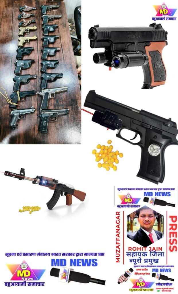 जनपद मुजफ्फरनगर कोतवाली पुलिस ने अवैध हथियारनुमा खिलौना लाइटर (पिस्टल और रिवाल्वर) की बिक्री पर बड़ी कार्रवाई करते हुए दर्जनों असलाहनुमा खिलौने जब्त किए जानकारी के अनुसार कोतवाली के पास स्थित एक जनरल स्टोर पर ये खिलौने 400 से 1000 ₹ तक में बेचे जाते थे शनिवार को रामलीला टीला क्षेत्र के दो युवकों की इन्हीं खिलौनों के साथ फोटो सोशल मीडिया पर वायरल हुई थी मामले का संज्ञान लेते हुए SSP संजय कुमार वर्मा ने तत्काल कार्रवाई के निर्देश दिए जिसके बाद शहर कोतवाल उमेश रोरिया ने अभियान चलाकर हथियारनुमा खेल खिलौनों की खेप बरामद की