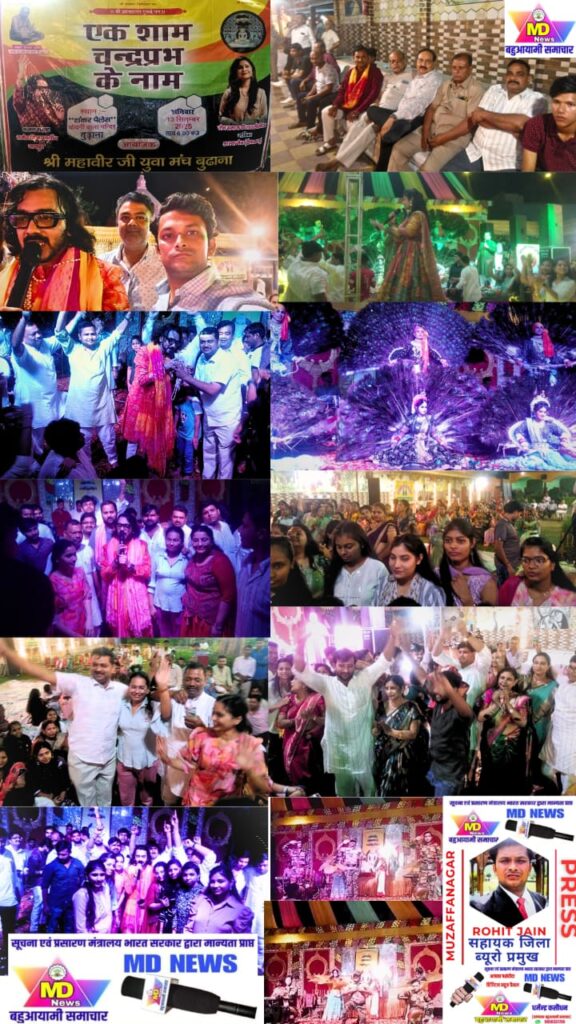 13 सितम्बर 2025जनपद मुजफ्फरनगर कस्बा बुढ़ाना में वार्षिक रथयात्रा महोत्सव श्री 1008 चांद प्रभु दिगम्बर जैन बड़ा मंदिरगत रात्रि शंकर पैलेस में श्री महावीर जी युवा मंच के युवा बालकों ने द्वितीय वर्ष कार्यक्रम आयोजन कराया व समस्त जैन समाज बुढ़ाना की और से बाबा श्री 1008 चन्द प्रभु भगवान की कृपा से एक शाम चंदा प्रभु जी के नाम प्रोग्राम का आयोजन किया जिसमे जनवाणी कन्या ग्रुप श्री महावीर जी युवा मंच ज्ञान सागर महाराज मंडल ग्रुप व समस्त कस्बा बुढ़ाना के जैन समाज के लोगों ने बढ़ चढ़ कर हिस्सा लिया छोटे बच्चों में उत्साह बड़े ही जोश रूप वह भगती भाव रूप मे दिखाई दिया और जिला बागपत के कस्बा बड़ौत जनपद मेरठ कस्बा सरधना मुजफ्फरनगर कस्बा काधला जनपद शामली से जैन समाज के लोगों ने भी आयोजन कार्यक्रम में पधार कर कार्यक्रम की शोभा बढ़ाई वही दूर दूर से गायकों को बुलाया गया जिसमे जैन समाज की लाडली आस्था जैन टीकमगढ़ भजन सम्राट राजीव विजयवर्गीय जयपुर वह देश भगती पर फ़ौजी भाई भारतीय जवान को भी जैन समाज के लोगों ने उनके त्याग व देश के सभी लोगों की सुरक्षा के लिए सरहद पर बलिदान देने वाले फौजी भाइयों को याद किया व आभार प्रकट कियावही राजीव विजयवर्गीय जी के भाव भरे सोग में माता पापा पर भी सोग गाया जिस पर माता पिता व बिटियो फूट फूट कर रोने लगेMD News बहुआयामी सामाचार चैनल जिला ब्यूरो प्रमुखरोहित जैन बुढ़ाना मुजफ्फरनगर