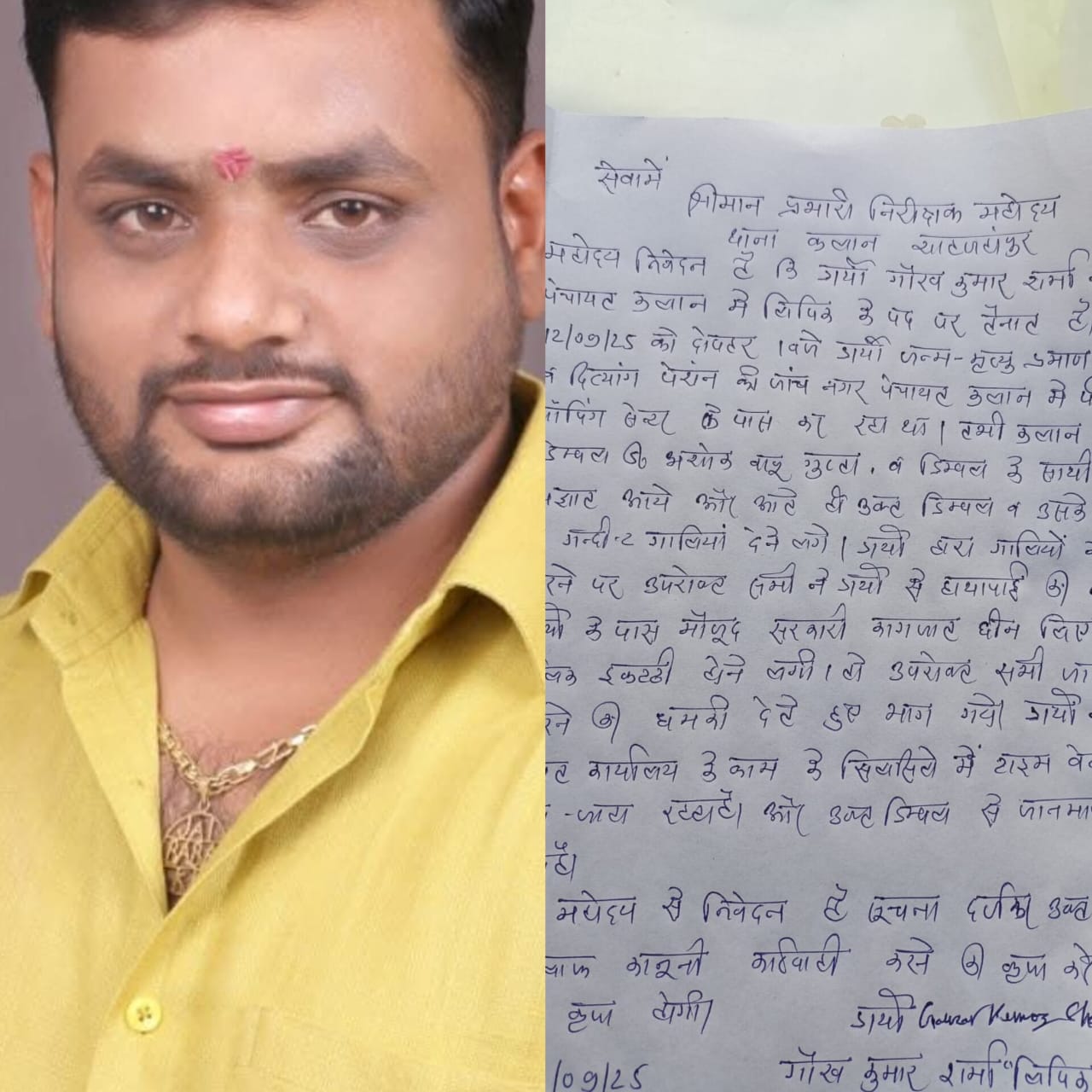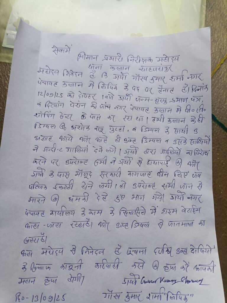 शाहजहांपुर। थाना कलान के नगर पंचायत पर कार्यरत लिपिक । गौरव कुमार शर्मा को आधा दर्जन दबंगों ने रास्ते में घेर कर सरकारी कागजों को फाड़ दिया और पिटाई की तथा भीड़ जमा हो जाने पर दबंगों ने जान से मार डालने की धमकी देते हुए फरार हो गए। इस घटना के लिखित नामजद प्रार्थना पत्र थाने पर दिया गया किंतु अभी तक पुलिस द्वारा कोई भी कार्रवाई न किए जाने से लिपिक की जान को खतरा बना हुआ है जानकारी के अनुसार नगर पंचायत कला पर कार्यरत गौरव कुमार शर्मा ने थाने पर दी गई तहरीर के मुताबिक बताया की दोपहर 1:00 बजे जन्म प्रमाण पत्र एवं दिव्यांग पेंशन की जांच शॉपिंग सेंटर के पास कर रहा था।