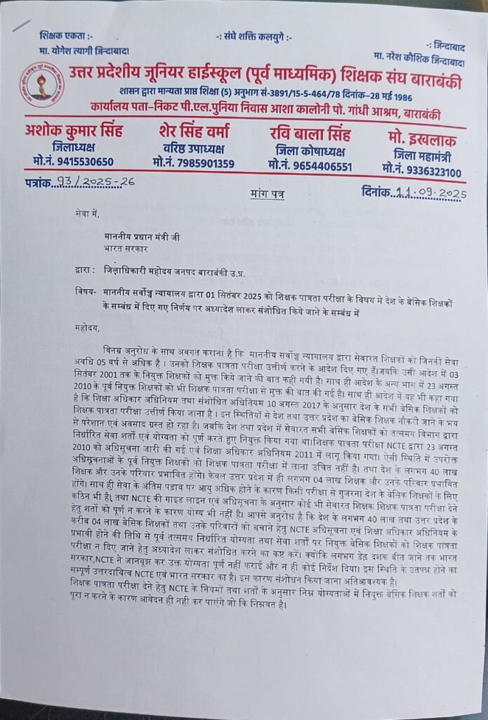 बाराबंकी: टेट प्रकरण पर माननीय सर्वोच्च न्यायालय के निर्णय के विरोध में रविवार को उत्तर प्रदेशीय जूनियर हाईस्कूल शिक्षक के ज़िला अध्यक्ष अशोक कुमार सिंह के नेतृत्व में खाद्य एवं रसद राज्य मंत्री सतीश शर्मा, एमएलसी अंगद सिंह, सदर विधायक सुरेश यादव और जैदपुर विधायक गौरव रावत से मुलाकात कर प्रधानमंत्री को संबोधित ज्ञापन सौंपा और मांग की कि 2010 से पहले बेसिक शिक्षा विभाग में आए शिक्षकों को टेट परीक्षा से मुक्त रखा जाए।
