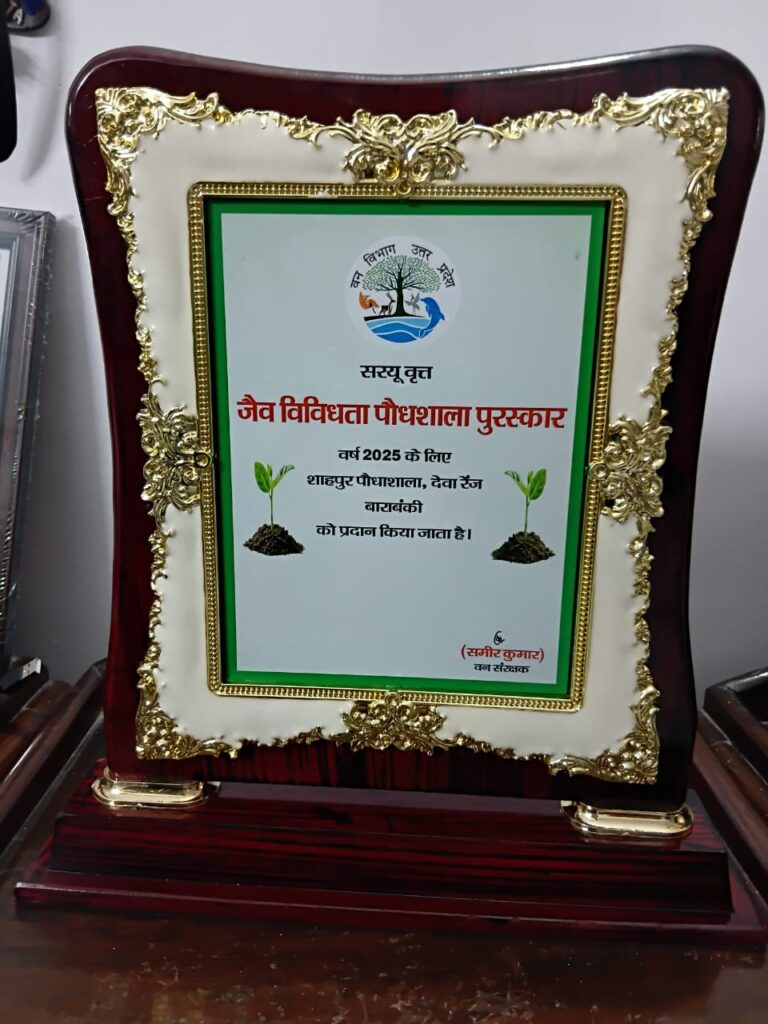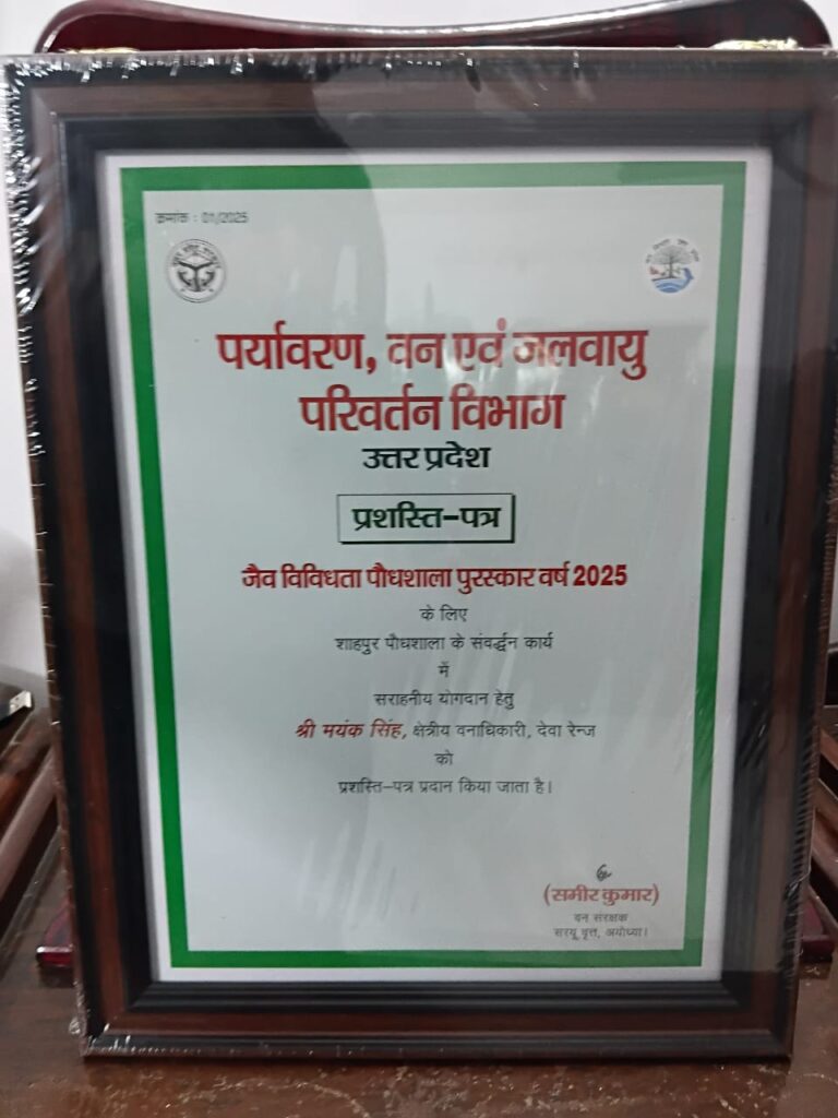 अयोध्या मंडल में सर्वाधिक 106 पौधों की प्रजातियों का उगान करने के लिए *देवां रेंज के अंतर्गत शाहपुर पौधशाला* को *”जैव विविधता पौधशाला पुरस्कार वर्ष 2025″* का प्रथम पुरस्कार प्राप्त हुआ है। क्षेत्राधिकारी देवां मयंक सिंह को प्रशस्ति पत्र से सम्मानित किया गया। वन संरक्षक अयोध्या मंडल श्री समीर कुमार ने प्रभागीय वन अधिकारी बाराबंकी श्री आकाशदीप बधावन एवं वन क्षेत्राधिकारी की प्रशंसा की।वन दरोगा श्री राजेश मिश्रा एवं श्री शत्रोहनलाल माली को भी उत्कृष्ट कार्य के लिए प्रशस्ति पत्र प्राप्त हुआ।उल्लेखनीय है कि मंडल में एकमात्र देवां रेंज की पौधशाला ही जैव विविधता के मानको पर खरी उतरी।