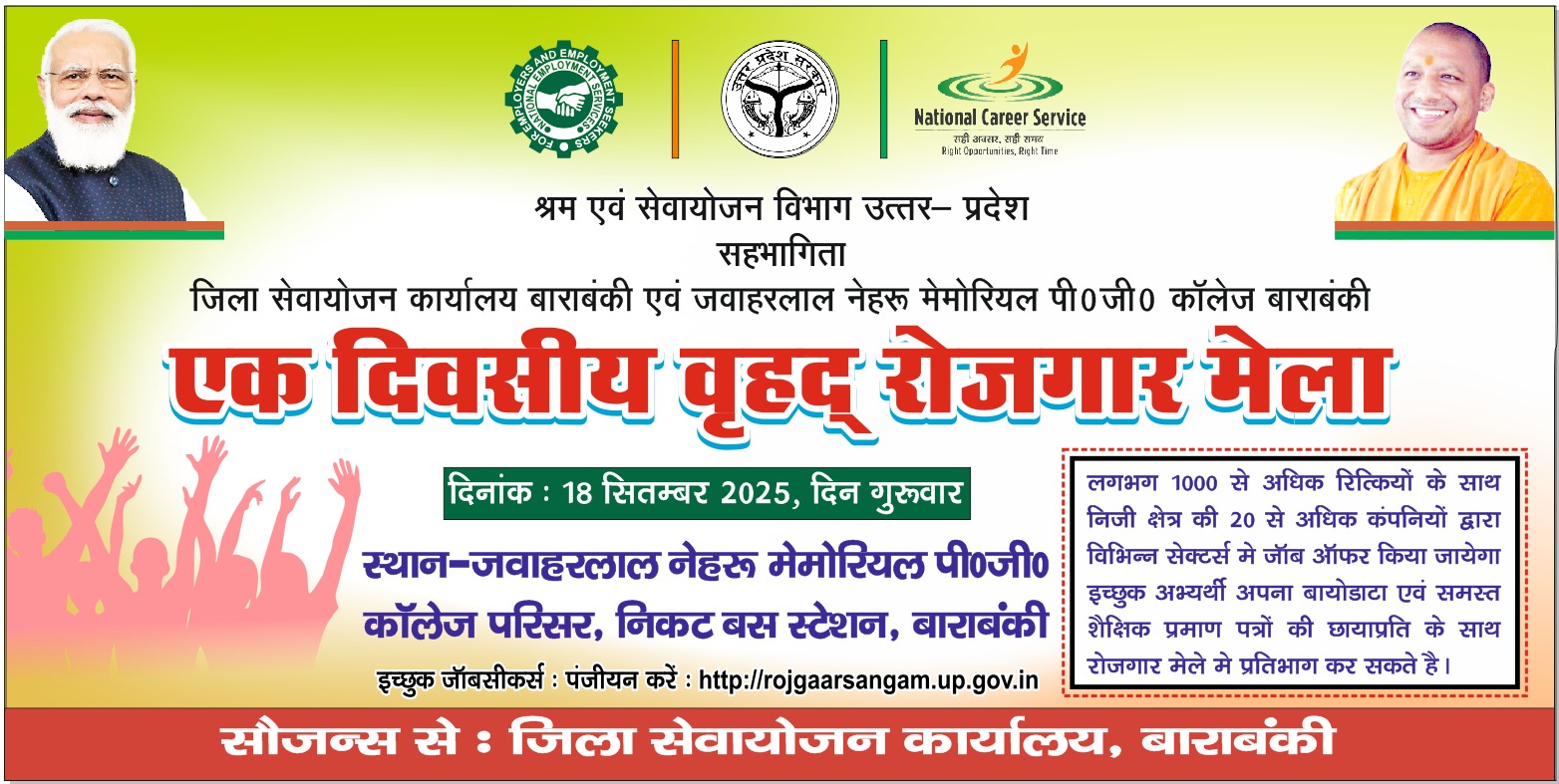 बाराबंकी। जिला सेवायोजन अधिकारी ने जानकारी देते हुए बताया कि जिला सेवायोजन कार्यालय, बाराबंकी एवं जवाहर लाल नेहरू मेमोरियल पी०जी कालेज, बाराबंकी के संयुक्त तत्वाधान में एक दिवसीय रोजगार मेला दिनांकः 18.09.2025 को प्रातः 10.00 बजे से कालेज परिसर में आयोजित किया जाना प्रस्तावित है। जिसमें (10) से अधिक कम्पनियाँ प्रतिभाग कर रही है। पूर्ण विवरण विभागीय पोर्टल पर उपलब्ध हैं। उक्त तिथि में आने वाली समस्त निजी क्षेत्रों की कम्पनियों का विवरण विभागीय वेब साइट rojgaarsangam.up.gov.in पर उपलब्ध है, इच्छुक अभ्यर्थी पंजीकरण कर आवेदन कर सकते है। अभ्यर्थी अपने समस्त शैक्षिक प्रमाण पत्रों के साथ मेले में प्रतिभाग कर सकते है।