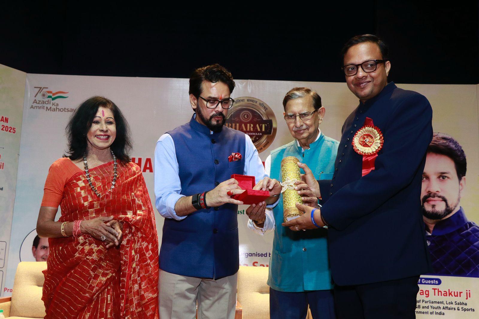 नई दिल्ली। प्रतिष्ठित भारत ‘प्रतिभा सम्मान समारोह 2025’, का आयोजन भारत प्रतिभा सम्मान परिषद द्वारा ऐतिहासिक प्रधानमंत्री संग्रहालय एवं पुस्तकालय में भव्य रूप से किया गया। कार्यक्रम में पूर्व केंद्रीय मंत्री माननीय अनुराग ठाकुर ने मुख्य अतिथि के रूप में शिरकत की। उनके साथ पद्मश्री सम्मानित प्रसिद्ध कथक नृत्यांगना शोवना नारायण तथा वरिष्ठ चिकित्सा विशेषज्ञ प्रो. (डॉ.) कमल कुमार सेठी विशिष्ट अतिथि के रूप में उपस्थित रहे। समारोह का संचालन और दिशा-निर्देशन परिषद के चेयरमैन नीरज भारतीय और डायरेक्टर मणि अय्यर के नेतृत्व में हुआ। मुख्य अतिथि पूर्व केंद्रीय मंत्री अनुराग ठाकुर ने अपने संबोधन में कहा कि भारत प्रतिभा सम्मान परिषद का यह प्रयास सराहनीय