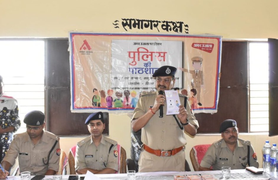 अमर उजाला फाउंडेशन की तरफ से आयोजित पुलिस की पाठशाला कार्यक्रम अभियान के दौरान वरिष्ठ पुलिस अधीक्षक बदायूँ द्वारा मिशन शक्ति अभियान फेज 4 के तहत महिलाओं की सुरक्षा, सम्मान एवं स्वावलंबन हेतु महत्वपूर्ण हेल्पलाइन नम्बरों की विस्तृत जानकारी व पेम्पलेट वितरित किये गये । अमर उजाला फाउंडेशन की तरफ से आयोजित ग्राम पंचायत भवन दुगरैय्या बृह्ममपुर विकास क्षेत्र सालारपुर थाना कुवरगाँव जनपद बदायूं में पुलिस की पाठशाला कार्यक्रम का आयोजन किया गया। जिसमें श्रीमान पुलिस अधीक्षक महोदय श्री डा0 ओ0पी0 सिंह, श्रीमान अपर पुलिस अधीक्षक नगर क्षेत्राधिकारी नगर श्री आलोक मिश्र व क्षेत्राधिकारी प्रशिक्षणाधीन श्री सुनील कुमार तथा अन्य अधि0गण मौजूद रहे । महोदय द्वारा पुलिस की पाठशाला कार्यक्रम में महिलाओं की सुरक्षा,सम्मान एवं स्वावलंबन हेतु मिशन शक्ति अभियान फेज-4.0 के तहत महिलाओं की सुरक्षा, सम्मान स्वावलंबन के विषय में चर्चा की गई । तथा महत्वपूर्ण महिला हेल्पलाइन नंबंर जैसे 1090 , डायल 112 ,181 ,1098 तथा 1076 आदि के संबंध में विस्तृत जानकारी दी गई व जागरुक किया गया । महिलाओं को पेम्पलेट भी वितरित किये गये।