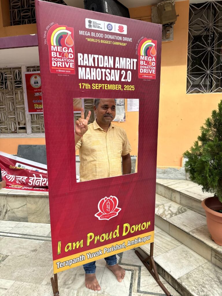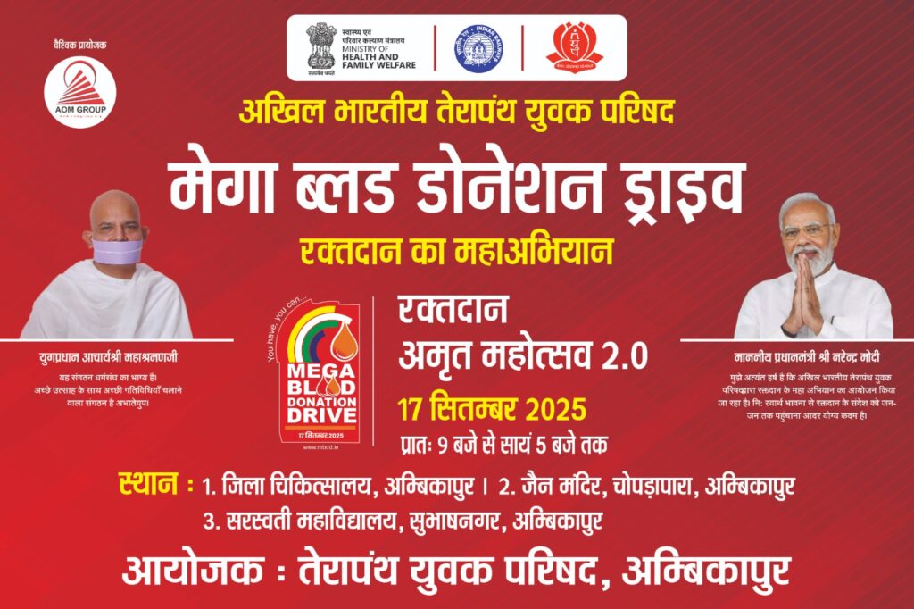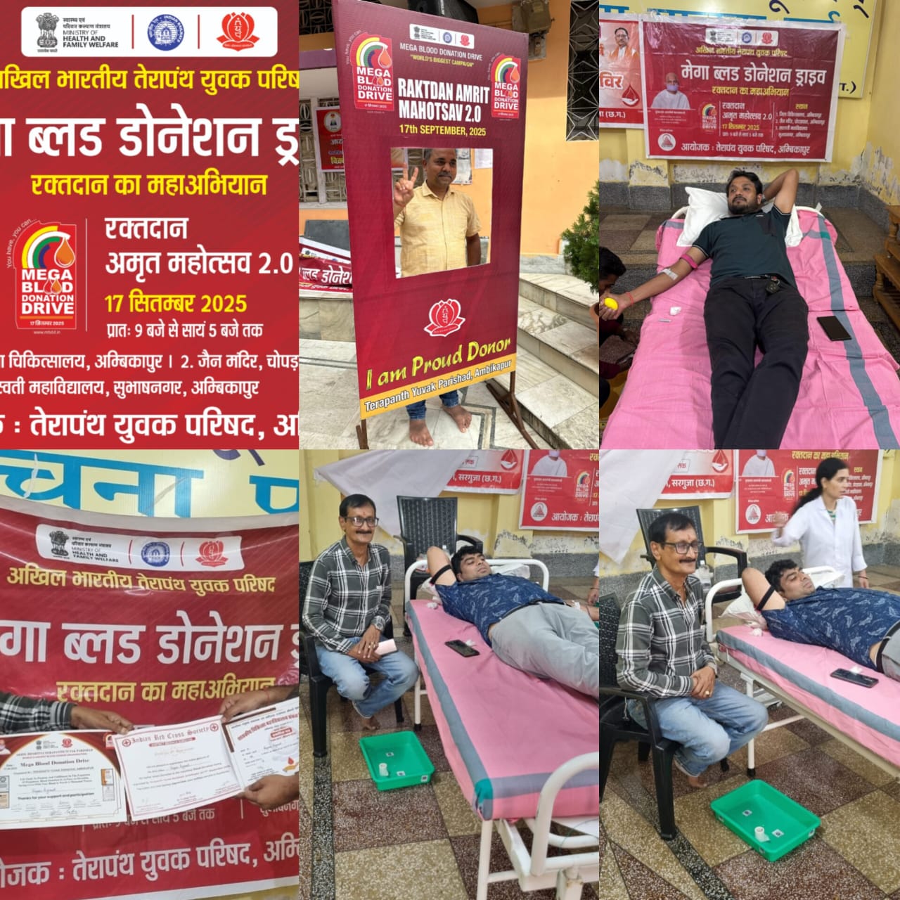 अंबिकापुर, 17 सितंबर — अखिल भारतीय तेरापंथ युवक परिषद के निर्देशन में तेरापंथ युवक परिषद शाखा अंबिकापुर के द्वारा एक विशाल रक्तदान शिविर का आयोजन किया गया। यह शिविर जैन मंदिर चोपड़ापारा, सरस्वती महाविद्यालय सुभाष नगर एवं जिला चिकित्सालय अंबिकापुर में आयोजित किया गया।