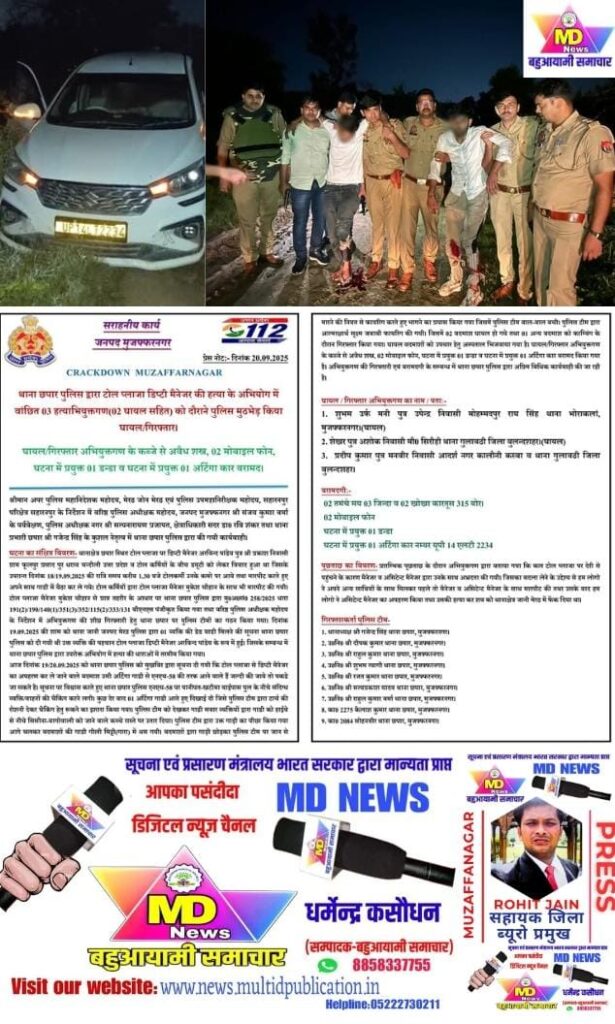 गिरफ्तार घायल/गिरफ्तार अभियुक्तगण के कब्जे से अवैध शस्त्र, 02 मोबाइल फोन, घटना में प्रयुक्त 01 डन्डा व घटना में प्रयुक्त 01 अर्टिगा कार बरामदश्रीमान अपर पुलिस महानिदेशक महोदय, मेरठ जोन मेरठ एवं पुलिस उपमहानिरीक्षक महोदय, सहारनपुर परिक्षेत्र सहारनपुर के निर्देशन में वरिष्ठ पुलिस अधीक्षक महोदय, जनपद मुजफ्फनगर श्री संजय कुमार वर्मा के पर्यवेक्षण, पुलिस अधीक्षक नगर श्री सत्यनारायण प्रजापत, क्षेत्राधिकारी सदर डा0 रवि शंकर तथा थाना प्रभारी छपार श्री गजेन्द्र सिंह के कुशल नेतृत्व में थाना छपार पुलिस द्वारा की गयी कार्यवाही।घटना का संक्षिप्त विवरण थानाक्षेत्र छपार स्थित टोल प्लाजा पर डिप्टी मैनेजर अरविन्द पांडेय पुत्र श्री प्रकाश निवासी ग्राम फूलपुर प्रसाद पुर धराव चन्दौली उत्तर प्रदेश व टोल कर्मियों के बीच डयूटी को लेकर विवाद हुआ था जिसके उपरान्त दिनांक 18/19.09.2025 की रात्रि समय करीब 1.30 बजे टोलकर्मी उनके कमरे पर आये तथा मारपीट करते हुए अपने साथ गाडी में बैठा कर ले गये। टोल कर्मियों द्वारा टोल प्लाजा मैनेजर मुकेश चौहान के साथ भी मारपीट की गयी। टोल प्लाजा मैनेजर मुकेश चौहान से प्राप्त तहरीर के आधार पर थाना छपार पुलिस द्वारा मु0अ0सं0 258/2025 धारा 191(2)/190/140(1)/351(3)/352/115(2)/333/131 बीएनएस पंजीकृत किया गया तथा वरिष्ठ पुलिस अधीक्षक महोदय के निर्देशन में अभियुक्तगण की शीघ्र गिरफ्तारी हेतु थाना छपार पर पुलिस टीमों का गठन किया गया दिनांक 19.09.2025 की शाम को थाना जानी जनपद मेरठ पुलिस द्वारा 01 व्यक्ति की डेड बाडी मिलने की सूचना थाना छपार पुलिस को दी गयी थी उक्त व्यक्ति की पहचान टोल प्लाजा डिप्टी मैनेजर अरविन्द पांडेय के रूप में हुई। जिसके सम्बन्ध में थाना छपार पुलिस द्वारा उपरोक्त अभियोग में हत्या की धाराओं में तरमीम किया गया।आज दिनांक 19/20.09.2025 को थाना छपार पुलिस को मुखबिर द्वारा सूचना दी गयी कि टोल प्लाजा से डिप्टी मैनेजर का अपहरण कर ले जाने वाले बदमाश उसी अर्टिगा गाडी से एनएच-58 की तरफ आने वाले हैं जल्दी की जाये तो पकडे जा सकते है। सूचना पर विश्वास करते हुए थाना छपार पुलिस एनएच-58 पर पानीपत-खटीमा बाईपास पुल के नीचे संदिग्ध व्यक्ति/वाहनों की चैकिंग करने लगी। कुछ देर बाद 01 अर्टिगा गाडी आते हुए दिखाई दी जिसे पुलिस टीम द्वारा टार्च की रोशनी देकर चैकिंग हेतु रूकने का इशारा किया गया। पुलिस टीम को देखकर गाडी सवार व्यक्तियों द्वारा गाडी को हाईवे से नीचे सिसौना-बागोवाली को जाने वाले कच्चे रास्ते पर उतार दिया। पुलिस टीम द्वारा उक्त गाड़ी का पीछा किया गया आगे चलकर बदमाशों की गाडी गीली मिट्टी(गारा) में धस गयी। बदमाशों द्वारा गाड़ी छोड़कर पुलिस टीम पर जान से मारने की नियत से फायरिंग करते हुए भागने का प्रयास किया गया जिसमें 