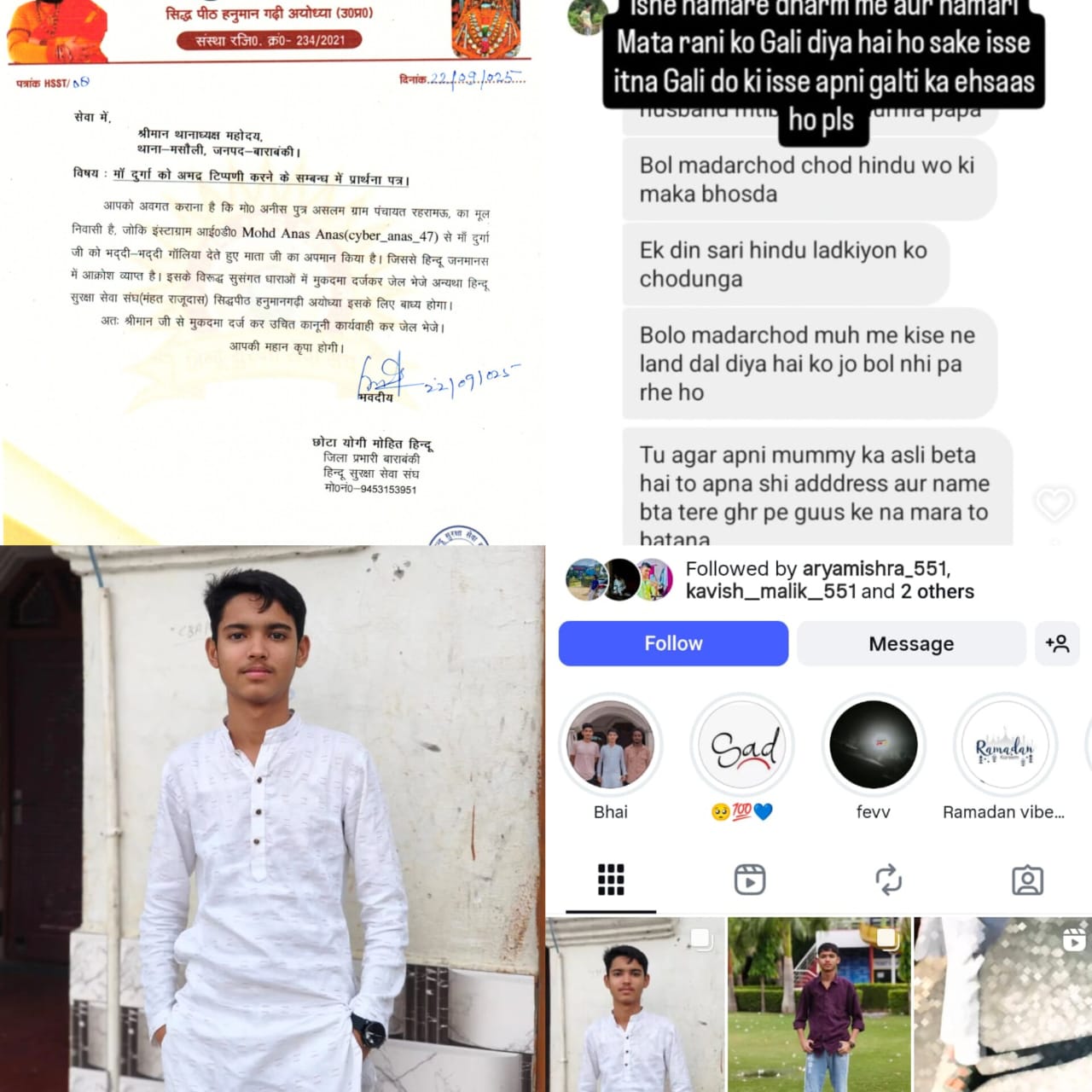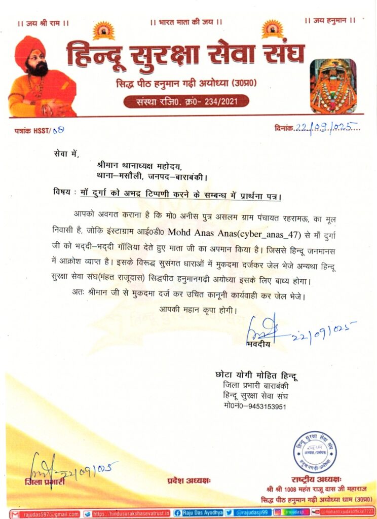 बाराबंकी जनपद के ग्राम पंचायत रहरामऊ के मोहम्मद अनीश पुत्र असलम का है जिसने अपनी इंस्टाग्राम आईडी के माध्यम से मां दुर्गा को गंदी गंदी गलियां व हिंदू की मां बहन की गली सहित अपमानजनक शब्दों की टिप्पणी करने वाले को थाना मसौली पुलिस ने धर दबोचा।