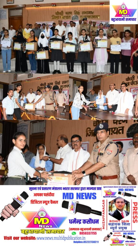 जनपद मुजफ्फरनगर में वरिष्ठ पुलिस अधीक्षक चौधरी चरण सिंह सभागार जिला पंचायत मुजफ्फरनगर में मुख्यमंत्री बाल सेवा योजना एवं मिशन शक्ति 5.0 अभियान के अंतर्गत जिला पंचायत अध्यक्ष श्री वीरपाल निर्वाल DM श्री उमेश मिश्रा एवं SSP श्री संजय कुमार वर्मा द्वारा छात्र-छात्राओं को लैपटॉप एवं धनराशि का किया गया वितरण विभिन्न हेल्पलाइन सेवाओं के विषय में किया गया जागरूक