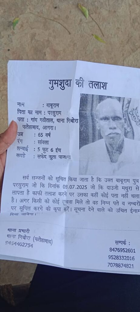 आगरा के थाना निबोहरा क्षेत्र के गांव गढ़ीताल महाराजपुर से परिवार के साथ मथुरा श्री गोवर्धन महाराज जी के परिक्रमा लगाने गये बाबूलाल बिछड़ गए अभी वापिस घर नहीं आए कई बार गोवर्धन जाकर खोजा लेकिन कोई पता नहीं चला बाबूराम के न मिलने से परिवार वाले बहुत दुखी है बाबूलाल के लड़के ने बताया कि वह परिवार के साथ परिक्रमा लगाने के बाद जब दाऊजी महाराज जी के मंदिर में पहुंचे तो वह बिछड़ गए बहुत खोजने पर भी नहीं मिले ओर बताया जब परिवार का जिम्मेवार व्यक्ति गुम हो जाता है तब परिवार पर बालों पर दुखो का संकट आ जाता है