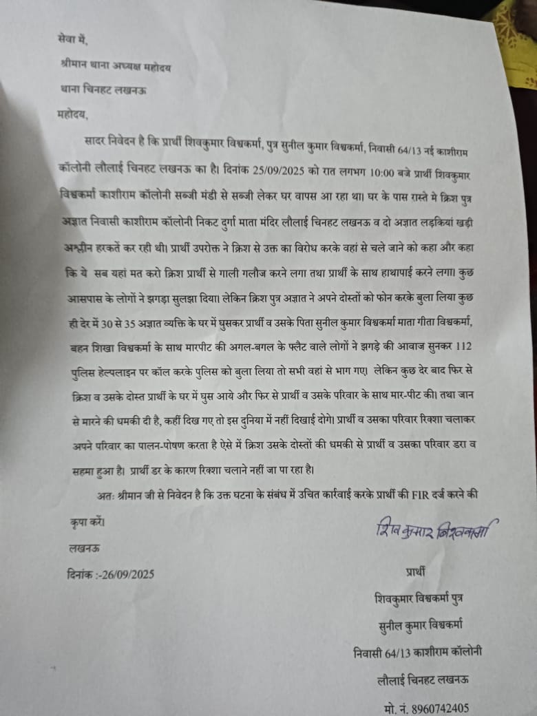 लोले रोड काशीराम कालोनी एक रिक्शा चले जिसका नाम शिव कुमार विश्वकर्मा मकान संख्या 64 /13 नई काशीराम कालोनी का निवासी हैं या एक रिक्शा चालक है कल दिनांक 25 9 2025 को रात को लगभग 10:00 बजे प्रार्थी शिवकुमार विश्वकर्मा काशीराम कॉलोनी सब्जी मंडी से सब्जी लेकर घर वापस आ रहा था घर के पास रास्ते में क्रिस पुत्र अज्ञात निवासी काशीराम निकट दुर्गा माता मंदिर लखनऊ वह दो अज्ञात लड़कियों खड़ी अश्लील हरकतें कर रहे थी
