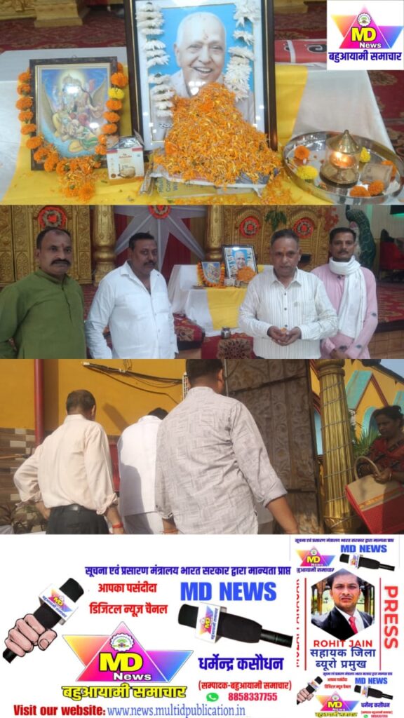 जनपद मुजफ्फरनगर कस्बा बुढ़ाना में आज लाला स्वo राम स्वरूप तायल जी की रस्म पगड़ी पर MD News परिवार की और से जिला ब्यूरो प्रमुख रोहित जैन जी शोक सभा में शोकाकुल परिवार से मिले वही परिवार सब के सदस्यों से वार्तालाप अशोक तायल योगेश तायल दिनश तायल सुशील तायल (बोबी भाई) अंकुर तायल (बंटी भाई) से मिले वहीं सभा में श्री महाराज अग्रसैन युवा समिति बुढ़ाना, श्री महाराज अग्रसैन युवा संगठन बुढ़ाना, अग्रवाल समाज बुढ़ाना, व्यापार मंडल, श्री 1008 चंदा प्रभु दिगम्बर जैन की ओर से श्री रामलीला प्रदर्शन कमेटी(रजिo) बुढ़ाना, विश्व हिंदू परिषद बजरंग दल, गवर्नमेंट पेंशनर्स वैलफेयर आर्गेनाइजेशन यू.पी. की और से उत्तर प्रदेश उद्योग व्यापार मंडल (रजिo) शोकपत्र देकर परिवार का दुख बता वह प्रभु से दिव्य आत्म को अपने श्री चरणो में स्थान दे यह प्रार्थना की