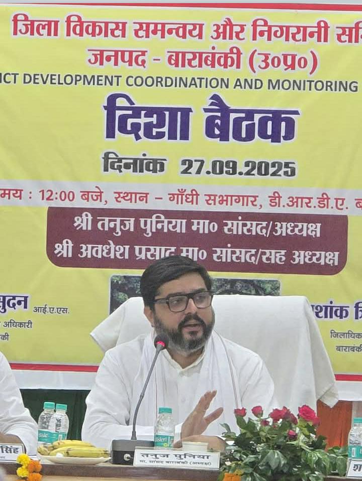जिला विकास समन्वय निगरानी समिति दिशा की बैठक की अध्यक्षता सांसद बाराबंकी तनुज पुनिया ने की इस मौके पर विधान परिषद सदस्य एमएलसी अंगद सिंह सदर विधायक धर्मराज यादव विधायक दिनेश रावत जिलाधिकारी बाराबंकी शशांक त्रिपाठी पुलिस अधीक्षक अर्पित विजय वर्गीय एवं संबंधित विभाग के अधिकारी उपस्थित रहे बैठक की अध्यक्षता करते हुए जिले में चल रही योजनाओं की प्रगति की विस्तृत समीक्षा की गई एवं इस दौरान संबंधित विभागों के अधिकारियों को आवश्यक दिशा निर्देश दिए गए ताकि योजनाओं का लाभ समय बध् और पारदर्शी तरीके से अंतिम व्यक्ति तक पहुंच सके सांसद तनुज पुनिया ने कहा कि जनहित के कार्यों में गति और गुणवत्ता दोनों ही हमारी प्राथमिकता है जनता का हित ही हमारा संकल्प है वर्तमान में बाराबंकी जिले के जिलाधिकारी पुलिस अधीक्षक सांसद सभी युवा है और यही युवा जिले के विकास को आगे बढ़ने का कार्य कर रहे हैं आज हम जानते हैं जिला विकास एवं समन्वय एवं निगरानी समय दिशा है क्या। समिति दिशा, जिसे जिला विकास समन्वय और निगरानी समिति (दिशा) के नाम से भी जाना जाता है, भारत सरकार द्वारा गठित एक महत्वपूर्ण समिति है। इसका मुख्य उद्देश्य जिला स्तर पर केंद्र सरकार की विभिन्न योजनाओं और कार्यक्रमों के क्रियान्वयन की निगरानी करना और समन्वय में सुधार करना है।