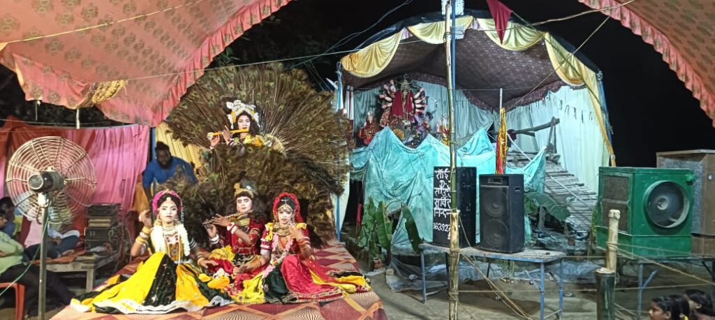 शारदीय नवरात्रि के शुभ अवसर पर जहां गांव गांव में मां जगत जननी की मूर्तियों की स्थापना कर मां भक्तों द्वारा प्रतिदिन पूजा अर्चना की जा रही है।वहीं तमाम स्थानों पर भागवत कथा,भजन कीर्तन व भव्य झांकियां प्रस्तुत कर मां का गुणगान कर रहे हैं।इसी क्रम में विकासखंड देवा के उमरी स्थित भुईहारे बाबा देव स्थान पर स्थापित मां भगवती के दरबार में बीती रात संध्या आरती के पश्चात न्यू म्यूजिकल राम हेतु रसिया झांकी ग्रुप सोनू झमाझम बाराबंकी एंड पार्टी द्वारा गणेश वंदना,दुर्गा आरती,राधा कृष्ण रास लीला,शिव तांडव,फूलों की होली आदि झांकियां प्रस्तुत कर मां दरबार में शमां बांध दिया जिसपर भक्तगण जय माता दी के जय घोष के साथ तालियां बजाने को मजबूर हो गए।इस अवसर पर ग्राम वासियों सहित अन्य गांवों के सैकड़ों महिला पुरुष मां भक्तों ने झांकियों का आनंद प्राप्त किया।