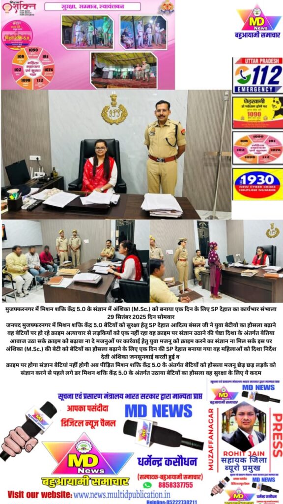 MD News बहुआयामी सामाचार चैनल जिला ब्यूरो प्रमुख रोहित जैन बुढ़ाना मुजफ्फरनगर29 सितंबर 2025 दिन सोमवारजनपद मुजफ्फरनगर में मिशन शक्ति केंद्र 5.0 बेटियों को सुरक्षा हेतु SP देहात आदित्य बंसल जी ने युवा बेटी यो का हौसला बढ़ाने वह बेटियों पर हो रहे क्राइम अत्याचार से लड़कियों को एक नहीं रहा वह क्राइम पर संज्ञान उठाने की चेष्टा दिशा के अंतर्गत बेतिया आवाज उठा सके क्राइम को बढ़ावा ना दे मजनुओं पर कार्रवाई हेतु युवा मजनू को क्राइम करने का संज्ञान ना मिल सके इस पर अंशिका (M.Sc.) की बेटी को बेटियों का हौसला बढ़ाने के लिए एक दिन की SP देहात बनाया गया वह महिलाओं को दिशा निर्देश देती अंशिका जनसुनवाई करती हुई व क्राइम पर होगा संज्ञान बेटियां नहीं होगी अब पीड़ित मिशन शक्ति केंद्र 5.0 के अंतर्गत बेटियों को हौसला मजनू छेड़ छड़ लड़के को संज्ञान करने से पहले लगे डर मिशन शक्ति केंद्र 5.0 के अंतर्गत उठाया बेटियों का हौसला वह सुरक्षा के लिए ये कदम उठाया
