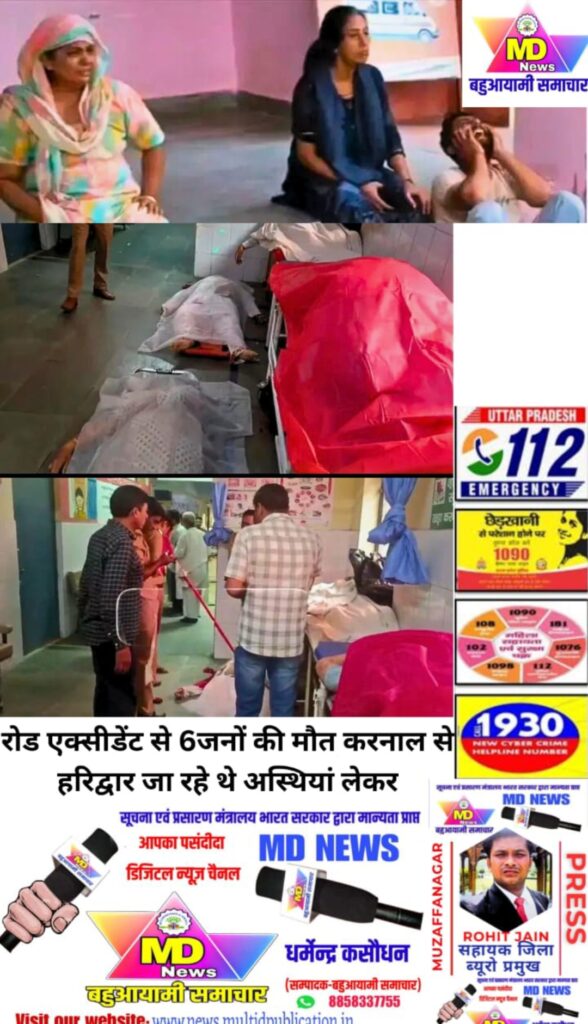 जनपद मुजफ्फरनगर के किताबी के बाईपास जयदेव होटल के पास हुई घटना बता दे करनाल से हरिद्वार अस्तिया लेकर जाते समय खड़े ट्रक के पीछे से घुसी कार 2 महिला सहित 6 लोगों की मौत एक घायल पुलिस मौके पर पहुंच कर शवो को निकालने में जुटी करनाल से हरिद्वार अस्तिया विसर्जन करने जा रहे थे परिजन