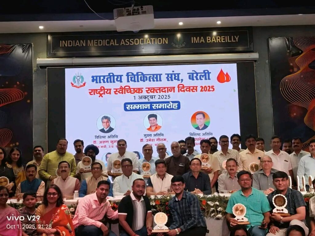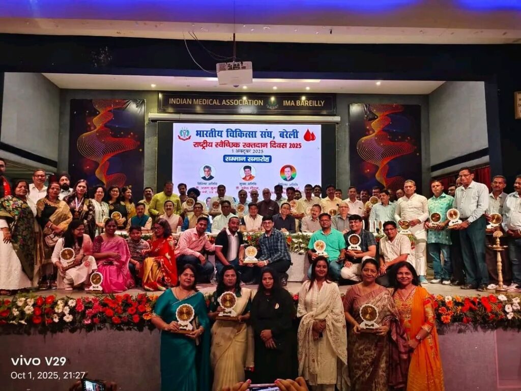 बरेली एवं आई एम ए की नवीन मनोनीत टीम के साथ महापौर बरेली डॉ उमेश गौतम जी, बिथरी विधायक डॉ राघवेंद्र शर्मा जी द्वारा रक्तदान करने वाले रक्तदाताओं को सम्मानित करते हुए साथ में आई एम ए अध्यक्ष डॉ अतुल श्रीवास्तव,डॉ अंशु अग्रवाल, डॉ विनोद पगरानी, डॉ विमल कुमार भरद्वाज, डॉ शालिनी महेश्वरी, डॉ अजय भारती एवं डॉ रवि मेहरा, आई एम ए डाईरेकटर डॉ अंजू उप्पल्, मेडिकल ऑफिसर डॉ पारुल प्रिया, व डॉ जे पी सेठी ने अन्य रक्तदाताओं को उनके द्वारा किये गए रक्तदान के लिए सम्मानित किया।