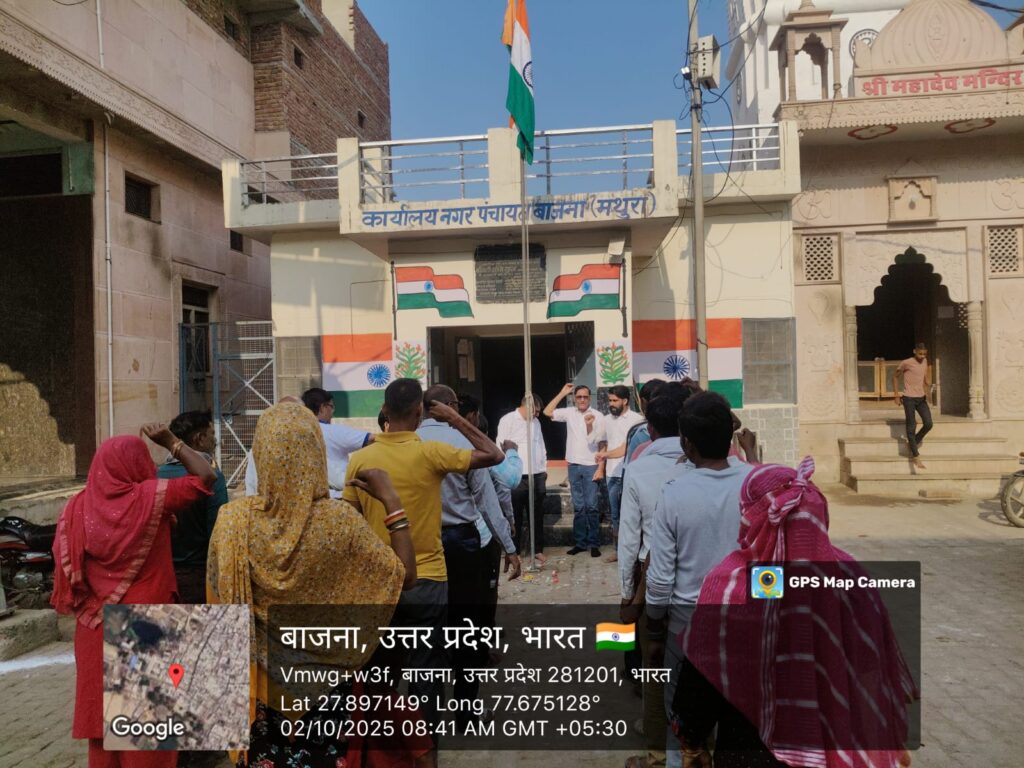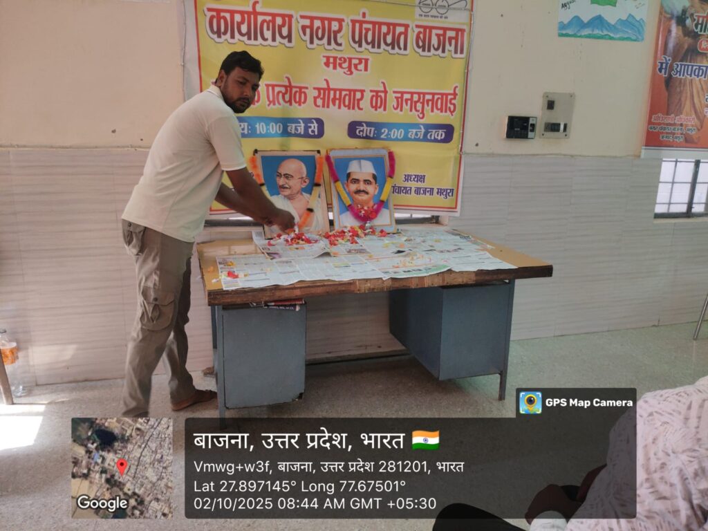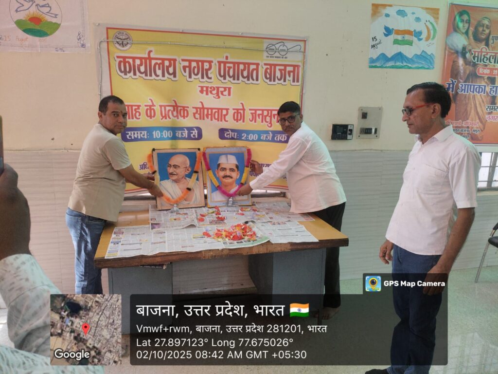 *ब्रेकिंग न्यूज बाजना मथुरा न्यूज़ रिपोर्टर दीपक कुमार* ** बॉडी: जनपद मथुरा के कस्बा बाजना में 2 अक्टूबर को गांधी जयंती और लाल बहादुर शास्त्री जी की जयंती पर नगर पंचायत बाजना में ध्वजारोहण का आयोजन किया गया । इस कार्यक्रम में नगर पंचायत अध्यक्ष (सुभाष चौधरी)और समस्त सभासद और कर्मचारी और नागरिक मौजूद रहे।कार्यक्रम में नारे गुंजे और पुष्प अर्पित किए गए।Quote: सभासदों ने गांधी की के विचारों को अपनाने और समाज में स्वच्छता और समानता का संदेश फैलाने की अपील की और वही कर्मचारियों ने नगर को स्वच्छ और बेहतर बनाने का संकल्प लिया।इसी के साथ बने रहिए md news न्यूज़ रिपोर्टर दीपक कुमार