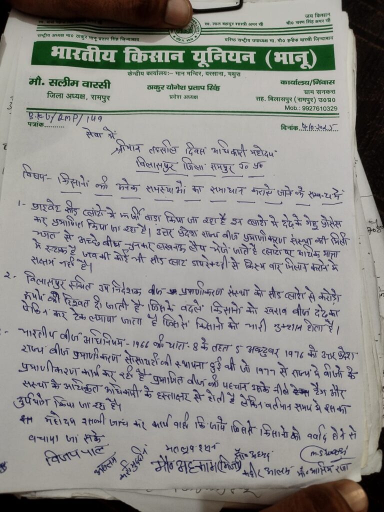 रामपुर। भारतीय किसान यूनियन (भानु) के जिला अध्यक्ष सलीम वारसी के नेतृत्व में सनिवार को किसानों ने प्राइवेट सीड प्लांटों में चल रहे फर्जीवाड़े का खुलासा करते हुए बिलासपुर तहसील दिवस में तीन सूत्र ज्ञापन उप जिला अधिकारी अरुण कुमार महोदय को दिया किसानों को आश्वासन दिया तथा अतिशीघ्र कार्रवाई करने का आश्वासन दिया इससे पहले किसानों को संबोधित करते हुए जिला अध्यक्ष ने कहा कि इन प्लांटों में दढ़े का गेहूं प्रोसेस कर प्रमाणित बीज के नाम पर किसानों को बेचा जा रहा है। उन्होंने आरोप लगाया कि उत्तर प्रदेश राज्य बीज प्रमाणीकरण संस्था की मिलीभगत से अच्छे बीज चुनकर लखनऊ लैब भेजे जाते हैं, जो आसानी से पास होकर वापस आते हैं। इसके बाद वैरायटी के हिसाब से पैकिंग होती है, लेकिन असली गड़बड़ी यहीं से शुरू होती है। किसान नेताओं के अनुसार, सीड प्लांटों पर भारी मात्रा में अवैध स्टॉक मौजूद है, जबकि कोई भी प्लांट डायरेक्टरी से किस्म वार मिलान कराने में सक्षम नहीं है। सलीम वारसी ने यह भी कहा कि बीज प्रमाणीकरण संस्था से मिलने वाले नीले टैग की डुप्लीकेट कॉपी प्रिंटिंग प्रेस से तैयार कर बाजार में नकली बीज उतारे जा रहे हैं। साथ ही संस्था से अनुमोदित बैग का प्रयोग न कर अन्य बैग लगाए जा रहे हैं। अंडर साइज गेहूं को कागजों में किसानों के नाम पर वापस दिखाया जाता है। उन्होंने गंभीर आरोप लगाया कि इस पूरे खेल में बिलासपुर स्थित उप निदेशक, बीज प्रमाणीकरण संस्था को सीड प्लांटों से करोड़ों रुपये की रिश्वत दी जाती है। इस गोरखधंधे में किसानों को भारी नुकसान उठाना पड़ रहा है।किसान नेताओं ने कहा कि भारतीय बीज अधिनियम-1966 की धारा-8 के तहत 5 अक्टूबर 1976 को उत्तर प्रदेश राज्य बीज प्रमाणीकरण सोसायटी की स्थापना हुई थी, जो 1977 से राज्य में बीजों के प्रमाणीकरण का कार्य कर रही है। प्रमाणित बीज की पहचान उसके नीले टैग और संस्था के अधिकृत अधिकारी के हस्ताक्षर से होती है। लेकिन वर्तमान समय में इस व्यवस्था का खुला दुरुपयोग हो रहा है। पंचायत में किसानों ने चेतावनी दी कि यदि सीड प्लांटों की निष्पक्ष जांच और दोषियों पर कड़ी कार्रवाई नहीं हुई तो आंदोलन को और व्यापक किया जाएगा। प्रदर्शन करने वालों में युवा जिला अध्यक्ष मोहम्मद आसिम राजा आरिफ खान सोनू मोहम्मद अहकाम इंतेज़ार अली जगतार सिंह मुराद खान मक्खन सिंह श्याम मोहन पांडेय नाजिम अली रिज़वान जीत सिंह कदीर आलम मतलूब हसन करीमुद्दीन मुबारक हसन इमरान रजा एहताम मुकेश श्रीवास्तव भूपराम जमुना प्रसाद बड़ी संख्या में किसान मौजूद रहे।——————– सहायक ब्यूरो चीफ रफीउल्लाह खान की स्पेशल रिपोर्ट रामपुर से एम डी न्यूज़