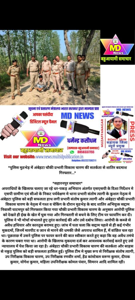 जनपद सहारनपुर अपराधियों के खिलाफ चलाए जा रहे धर-पकड़ अभियान अंतर्गत एसएसपी के दिशा निर्देशन मे एसपी ग्रामीण एवं सीओ के निकट पर्यवेक्षण मे थाना प्रभारी संतोष त्यागी के कुशल नेतृत्व मे अंबेहटा पुलिस को बड़ी सफलता हाथ लगी प्रभारी संतोष कुमार त्यागी और अंबेहटा चौकी प्रभारी विकास चारण के नेतृत्व में गश्त व चेकिंग के दौरान मुठभेड़ के बाद शातिर अभियुक्त सद्दाम निवासी घाटमपुर को गिरफ्तार किया गया चौकी प्रभारी विकास चारण के अनुसार आरोपी पुलिस को देखते ही ईख के खेत में घुस गया और गिरफ्तारी से बचने के लिए टीम पर फायरिंग कर दी। पुलिस ने भी मोर्चा संभालते हुए तुरंत कार्रवाई की और उसे दबोच लिया। आरोपी के कब्जे से अवैध हथियार और कारतूस बरामद हुए। जांच में पता चला कि सद्दाम पहले से ही कई गंभीर मुकदमों, जिनमें मारपीट व जान से मारने की धमकी जैसे अपराध शामिल हैं, में वांछित चल रहा था। पूछताछ में उसने पुलिस पर फायर करने की बात स्वीकार करते हुए कहा कि वह अवैध तमंचे के कारण घबरा गया था। आरोपी के खिलाफ मुकदमा दर्ज कर आवश्यक कार्रवाई करते हुए उसे न्यायालय में पेश किया जा रहा है। अंबेहटा चौकी प्रभारी विकास चारण की सतर्कता और साहस से नकुड़ पुलिस को बड़ी सफलता हासिल हुई। पुलिस टीम मे मुख्य रूप से निरीक्षक संतोष त्यागी, उप निरीक्षक विकास चारण, उप निरीक्षक रणवीर शर्मा, हैड कांस्टेबल वरूण कुमार, दीपक कुमार, योगेश कुमार, महिला उपनिरीक्षक कोमल पंवार, सिमरन आदि शामिल रही