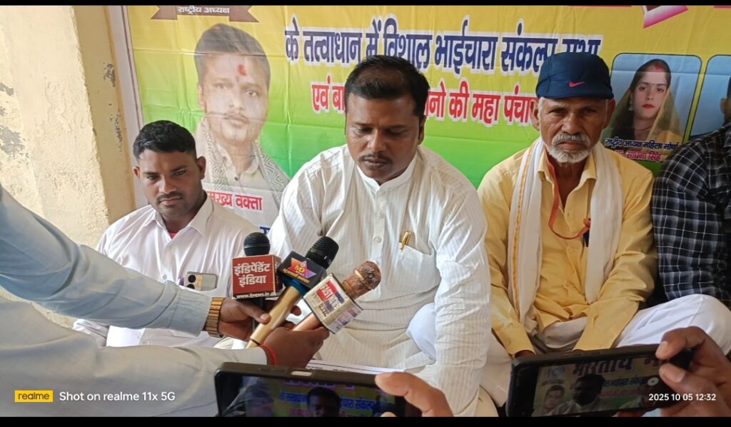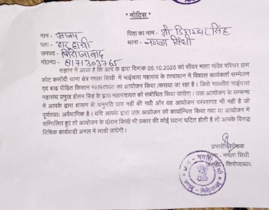 आगरा ,फतेहाबाद थाना क्षेत्र अंतर्गत एके ही गार्डन में भारतीय भाईचारा महासंघ के राष्ट्रीय अध्यक्ष होतम भैया ने की प्रेस वार्ता जिसमें उन्होंने बताया कि दिनांक 05/10/25 को भारतीय भाईचारा महासंघ की जनपद फिरोजाबाद तहसील टूंडला थाना नगला सिंघी क्षेत्र के अंतर्गत माता सीयर देवी मंदिर पर बाढ़ पीड़ित किसानों की एवं अन्य समस्या को लेकर जनसभा का आयोजन किया जा रहा था सीयर माता मंदिर पर पूरी तैयारी हो चुकी थी राष्ट्रीय अध्यक्ष होतम भैया ने बताया कि हमारी जनसभा के लिए आगरा प्रशासन द्वारा अनुमति दे दी गई थी और मंडल आयुक्त द्वारा भी अनुमति प्रदान की गई थी लेकिन अंतिम समय पर SDM टूंडला एवं CO टूंडला ने टेक्निकल इश्यू बताते हुए अनुमति को रद्द कर दिया गया और टेंट को उखाड़ दिया गया पोस्ट को फाड़ दिया गया है और 35 लोगों के नाम नोटिस काट दिए गए हैं