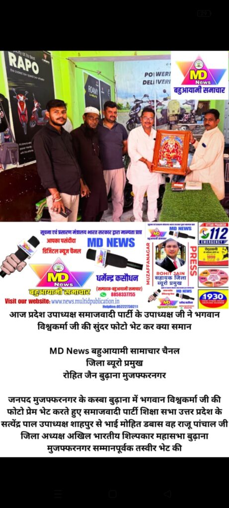 जनपद मुजफ्फरनगर के कस्बा बुढ़ाना में भगवान विश्वकर्मा जी की फोटो प्रेम भेट करते हुए समाजवादी पार्टी शिक्षा सभा उत्तर प्रदेश के सत्येंद्र पाल उपाध्यक्ष शाहपुर से भाई मोहित डबास वह राजू पांचाल जी जिला अध्यक्ष अखिल भारतीय शिल्पकार महासभा बुढ़ाना मुजफ्फरनगर सम्मानपूर्वक तस्वीर भेट की