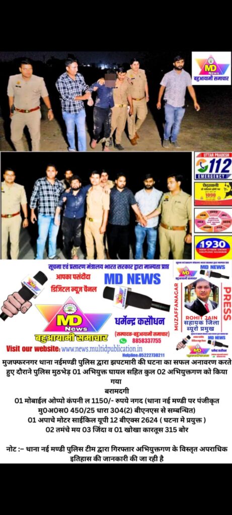 आज दिनांक 05.10.2025 को थाना नई मण्डी पुलिस द्वारा भोपा रोड पर टीएस मान चौराहे पर चेकिंग की जा रही थी, तभी मुजफ्फरनगर की तरफ से 01 मोटरसाइकिल तेज गति से आती दिखाई दी जिसे पुलिस टीम द्वारा चेकिंग हेतु रुकने का इशारा किया गया तो मोटरसाइकिल सवार नहीं रुके तथा पुलिस टीम पर जान से मारने की निय़त से फायर कर मोटरसाइकिल को रजवाहे पटरी पर मोड़कर भागने लगे बदमाशों के फाय़र से पुलिस टीम बाल बाल बची तथा बदमाशों का पीछा किया गया । कुछ दूरी पर जाकर कच्चा रास्ता तथा तीव्र गति होने के कारण बदमाशों की मोटरसाइकिल फिसल कर गिर गयी जिस पर दोनो बदमाश मोटरसाइकिल को मौके पर ही छोड़कर पुलिस टीम पर फायर करते हुए जंगल की तरफ भागने लगे पुलिस टीम द्वारा बदमाशों को फायरिंग बंद कर आत्मसमर्पण की चेतावनी दी गयी परन्तु बदमाशों पर पुलिस की चेतावनी का कोई असर नहीं हुआ तथा पुनः पुलिस टीम पर फायर किया गया पुलिस टीम द्वारा बदमाशों की फायरिंग रेंज में घुसकर आत्मरक्षार्थ सूक्ष्म जवाबी फायरिंग की गयी जिसमें 01 बदमाश फरमान पुत्र मौo मिया (बाएं पैर में गोली लगी है ) घायल हो गया तथा दूसरा बदमाश मौके से भाग गया जिसे थाना नई मण्डी पुलिस टीम द्वारा कॉम्बिंग के दौरान गिरफ्तार किया गया है गिरफ्तार अभियुक्तगण के कब्जे से लूटा गया मोबाईल, नगदी व घटना में प्रयुक्त 01 मोटरसाइकिल तथा अवैध शस्त्र बरामद किए गए हैं घायल अभियुक्त को उपचार हेतु अस्पताल में भर्ती कराया गया है अभियुक्तगण की गिरफ्तारी एवं बरामदगी के सम्बन्ध में थाना नई मण्डी पुलिस द्वारा अग्रिम विधिक कार्यवाही की जा रही है