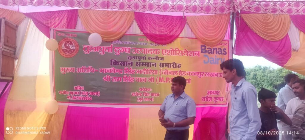 MD News kannauj तुलापूर्वा दुग्ध उत्पादन एसोसिएशंस उमर्दा कन्नौज किसान सम्मान समारोह मुख्य हेड मानवेंद्र सिंह भदौरिया कानपुर जोनल लखनऊ हेड तुलापूर्वा दूध उत्पादक एसोशिएशन वार्षिक साधारण सभा उमर्दा कन्नौज। इस सभा में अमूल डेयरी की तरफ से जोनल अधिकारी मानवेंद्र सिंह भदौरिया राम सिंह पाल mpo व डॉ राजेश परासत किसानों को दुग्ध उत्पादन बढ़ाने के लिए व भैंसे में अनेक प्रकार की बीमारियों जानकारी व उपचार के बारे में विस्तृतजानकारी दी वह किसानों के लिए उत्साह वरधन के लिए करने के लिए उपहार वितरण किया इस सभा की अध्यक्षता कर रहे राजेंद्र सिंह पूर्व प्रधान सचिव संजीव कुमार अध्यक्ष सर्वेश कुमार विकास यादव अनुपम कुमार सुमित कुमार अजीत यादव राकेश कुमार रजोल यादव मनीष कुमार अवधेश कुमार प्रवेश पाल गुड्डू यादव आज लोग इस सभा में कुशलता पूर्वक भाग लिया जिसके सचिव संजू यादव आदि लोग मौजूद रहे रिपोर्टर धर्मेंद्र सिंह
