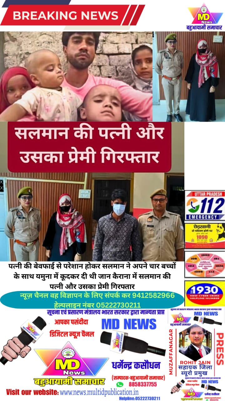 जनपद शामली के केराना आत्महत्या कांड बेवफा पत्नी और प्रेमी गिरफ्तार चार मासूमों समेत पिता ने यमुना में कूदकर दी थी जान उत्तर प्रदेश के जनपद शामली में पत्नी की बेवफाई से तंग आकर एक व्यक्ति द्वारा चार मासूम बच्चों सहित यमुना नदी में कूदकर आत्महत्या किए जाने के हृदय देहेला देने वाला मामले में पुलिस ने बड़ी कार्रवाई की है।पुलिस ने आत्महत्या के लिए उकसाने वाली आरोपी पत्नी और उसके प्रेमी को गिरफ्तार करने में सफलता पाली हैं