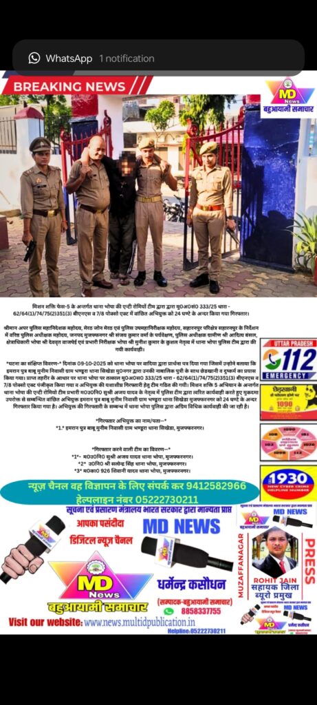 घटना का संक्षिप्त विवरण दिनांक 09-10-2025 को थाना भोपा पर वादिया द्वारा प्रार्थना पत्र दिया गया जिसमें उन्होने बताया कि इमरान पुत्र बाबू मुनीम निवासी ग्राम भण्डूरा थाना सिखेडा मु0नगर द्वारा उनकी नाबालिक पुत्री के साथ छेड खानी व दुष्कर्म का प्रयास किया गया प्राप्त तहरीर के आधार पर थाना भोपा पर तत्काल मु0अ0स0 333/25 धारा – 62/64(1)/74/75(2)351(3) बीएनएस व 7/8 पोक्सो एक्ट पंजीकृत किया गया व अभियुक्त की यशाशीघ्र गिरफ्तारी हेतु टीम गठित की गयी। मिशन शक्ति 5 अभियान के अन्तर्गत थाना भोपा की एन्टी रोमियो टीम प्रभारी म0उ0नि0 सुश्री अजय यादव के नेतृत्व में पुलिस टीम द्वारा त्वरित कार्यवाही करते हुए मुकदमा उपरोक्त से सम्बन्धित वांछित अभियुक्त इमरान पुत्र बाबू मुनीम निवासी ग्राम भण्डूरा थाना सिखेडा मुजफ्फरनगर को 24 घण्टे के अन्दर गिरफ्तार किया गया है। अभियुक्त की गिरफ्तारी के सम्बन्ध में थाना भोपा पुलिस द्वारा अग्रिम विधिक कार्यवाही की जा रही है।