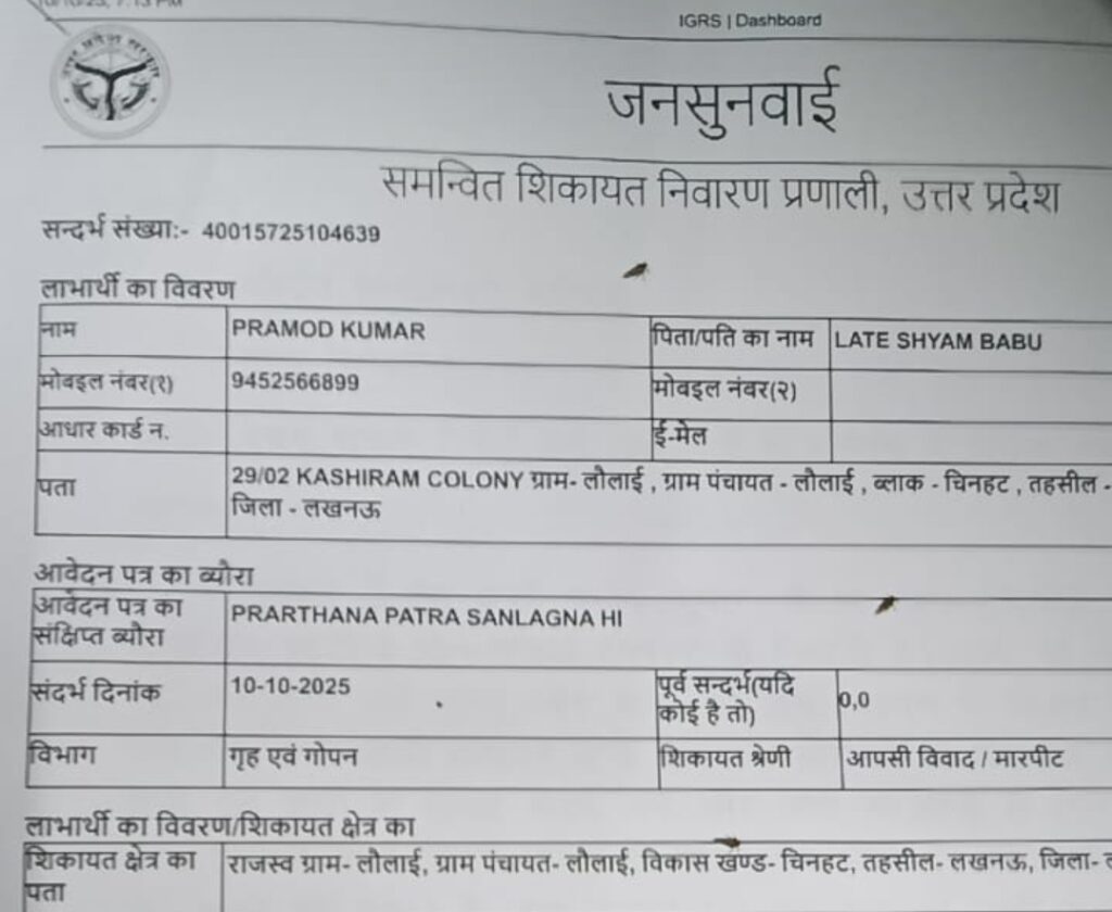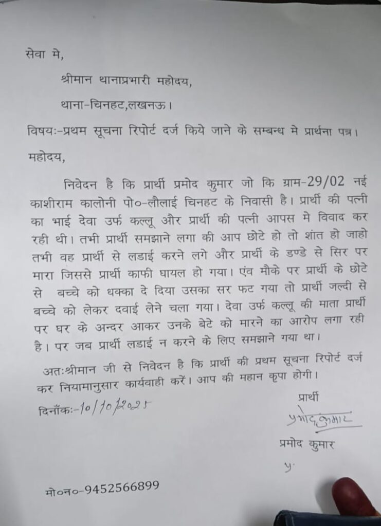 थाना चिनहट विकल्प खंड लोले रोड काशीराम कालोनी में प्रमोद कुमार वाइफ पत्नी बबली को देवा उर्फ कल्लू ने पत्नी को गाली गलौज देते हुए कहा कि हम किसी से डरते नहीं हैं झगड़ा हो रहा था कि मैं पहुंच गया और दोनों पास दोनों पक्षों को समझाया बुझाया मैंने अपने साले को गाल पर हाथ रखते हुए कहा कि तुम छोटे हो छोटे की तरह ही रहो तो कल्लू ने मेरे पर हाथापाई करना शुरू कर दिया देख मेरी धर्मपत्नी आई और मेरा छोटा बड़ा वाला लड़का शिव आय बढ़ाने के लिए तो कल ने मेरी पत्नी को चश्मा पहन रखी थी उसको तोड़ दिया और लड़के को ठोकर मार कर कील में सर जाकर कर लड़ गया जिससे वह लहूलुहान हो गया आता मैंने देखा तो भाग कर अस्पताल ले गया जहां पर उपचार कराया फिर मैं लाकर के घर पर बच्चों को छोड़ अपने घर पर और मामले को शांत कराया कुछ देर बीता कि इनका बीच वाला भाई जिनके नाम तुलसी है वह आते ही मेरे ऊपर लाठी डंडे से वार करने लगा लेकिन मैंने कुछ नहीं कहा ऊपर से उनकी मां जिनका नाम सुनीता देवी है उन्होंने आरोप लगाया कि यह लोग घर पर मिलकर हमारे बच्चे को मारने आए थे जबकि ऐसा कुछ नहीं था मैंने सिर्फ समझने के लिए गया था