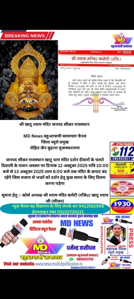 जनपद सीकर राजस्थान खाटू धाम मंदिर दर्शन दीवारों के चलते दिवाली के पावन अवसर पर दिनांक 12 अक्टूबर 2025 रात्रि 10:00 बजे से 13 अक्टूबर 2025 शाम 6:00 बजे तक मंदिर के कपाट बंद रहेंगे जिस वजाय से भक्तों को दर्शन हेतु कुछ समय के लिए विलम करना पड़ेगा