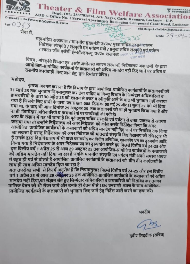 भारतीय जनता पार्टी की वर्तमान योगी सरकार में खुलेआम भातखंडे संस्कृति विश्वविद्यालय के द्वारा किए गए वाद्य यंत्र खरीद में कमीशन खोरी, वित्तीय अनियमितता शासकीय धन का दुरुपयोग किए जाने की लिखित शिकायत निदेशक संस्कृति से 2 जुलाई को करने के बाद निदेशक संस्कृति ने वित्त नियंत्रक के माध्यम से भातखंडे संस्कृति विश्वविद्यालय के द्वारा किए गए वाद्य यंत्र खरीद पत्रावली तलब की लेकिन सरकार की छवि को धुमिल कर रही संस्कृति विभाग की अपर निदेशक के द्वारा वित्त नियंत्रक पर दबाव बना कर कोई कार्यवाही नहीं किए जाने पर प्रेस वार्ता का आयोजन फिल्म अकादमी, तृतीय तल ,दिलीप पुर टावर,सप्रू मार्ग, हजरत गंज लखनऊ में दिनांक 12 अक्टूबर 25 को समय 2 बजे किया जाएगा
