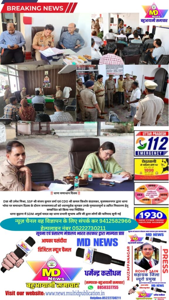 जनपद मुजफ्फरनगर के सभी थाना क्षेत्र में थाना समाधान दिवस पर सुनी गई लोगों की फरियादMD News बहुआयामी सामाचार चैनलजिला ब्यूरो प्रमुख रोहित जैन बुढ़ाना मुजफ्फरनगरआज जनपद मुज़फ्फरनगर के सभी थाना क्षेत्र में सुनी गई लोगों की फरियादDM श्री उमेश मिश्रा, SSP श्री संजय कुमार वर्मा एवं CDO श्री कमल किशोर कंडारकर, मुजफ्फरनगर द्वारा थाना भोपा पर समाधान दिवस के दौरान जनसमस्याओं को ध्यानपूर्वक सुनकर उनके गुणवत्तापूर्ण व त्वरित निस्तारण हेतु सम्बन्धित को किया गया निर्देशितथाना बुढ़ाना में SDM अपूर्वा यादव वह थाना प्रभारी सुभाष अत्रि जी द्वारा लोगों की फरियाद सुनी गई
