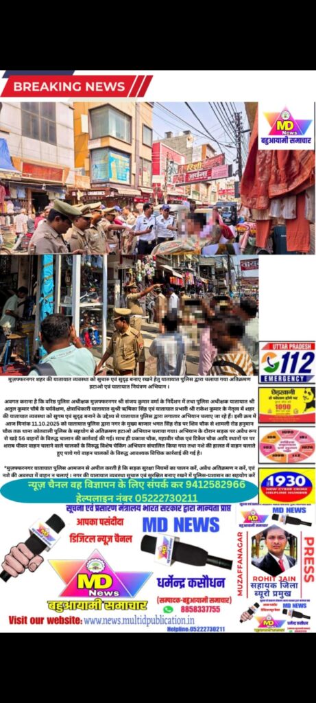 जनपद मुजफ्फरनगर से अवगत कराना है कि वरिष्ठ पुलिस अधीक्षक मुज़फ्फरनगर श्री संजय कुमार वर्मा के निर्देशन में तथा पुलिस अधीक्षक यातायात श्री अतुल कुमार चौबे के पर्यवेक्षण, क्षेत्राधिकारी यातायात सुश्री ऋषिका सिंह एवं यातायात प्रभारी श्री राकेश कुमार के नेतृत्व में शहर की यातायात व्यवस्था को सुगम एवं सुदृढ़ बनाने के उद्देश्य से यातायात पुलिस द्वारा लगातार अभियान चलाए जा रहे हैं। इसी क्रम में आज दिनांक 11.10.2025 को यातायात पुलिस द्वारा नगर के मुख्य बाजार भगत सिंह रोड पर शिव चौक से शामली रोड हनुमान चौक तक थाना कोतवाली पुलिस के सहयोग से अतिक्रमण हटाओ अभियान चलाया गया। अभियान के दौरान सड़क पर अवैध रूप से खड़े 56 वाहनों के विरुद्ध चालान की कार्रवाई की गई। साथ ही प्रकाश चौक, महावीर चौक एवं टिकैत चौक आदि स्थानों पर पर शराब पीकर वाहन चलाने वाले चालकों के विरुद्ध विशेष चेकिंग अभियान संचालित किया गया तथा नशे की हालत में वाहन चलाते हुए पाये गये वाहन चालकों के विरुद्ध आवश्यक विधिक कार्रवाई की गई है।